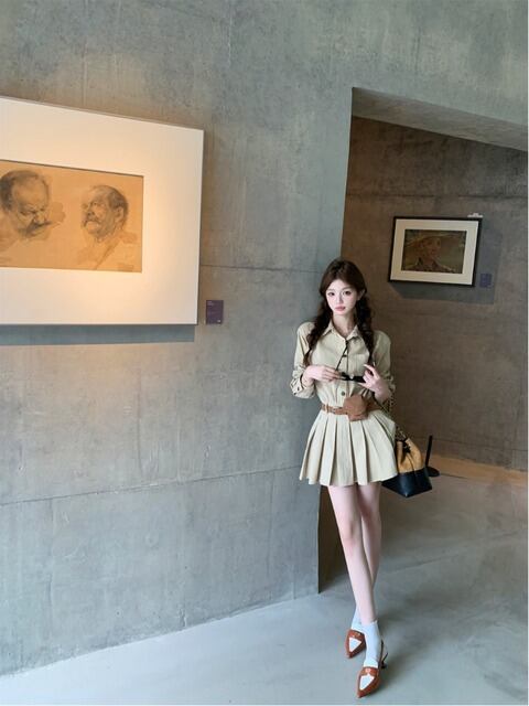 この【新しい韓国風のニッチなスリムなワークウェアスタイルのデザインシャツドレス】は、無地プリーツスカートとウエストバッグがセットになった、トレンドを取り入れた一着です。デザインと実用性を兼ね備えたこのシャツドレスは、仕事からプライベートまで幅広く活躍します。
