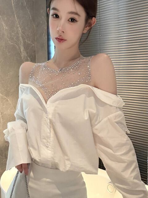 この【秋の女性のためのセクシーなワンショルダーラインストーンメッシュスプライシングトップ、甘くてスタイリッシュ、スリムウエストとオフショルダーの長袖シャツ】は、おしゃれな女性にぴったりの一着です。セクシーなワンショルダーと長袖デザインが絶妙に組み合わさり、甘さとスタイリッシュさを兼ね備えた印象を与えます。ラインストーンのディテールは華やかさを演出し、スリムなウエスト部分が引き立つことで、シルエットが美しく整います。特別なイベントやデートにも最適なアイテムです。