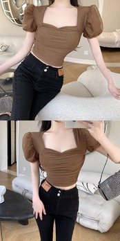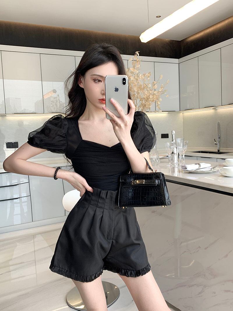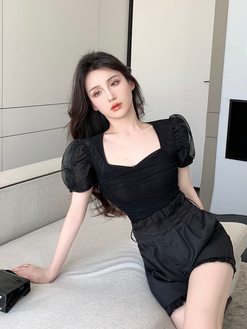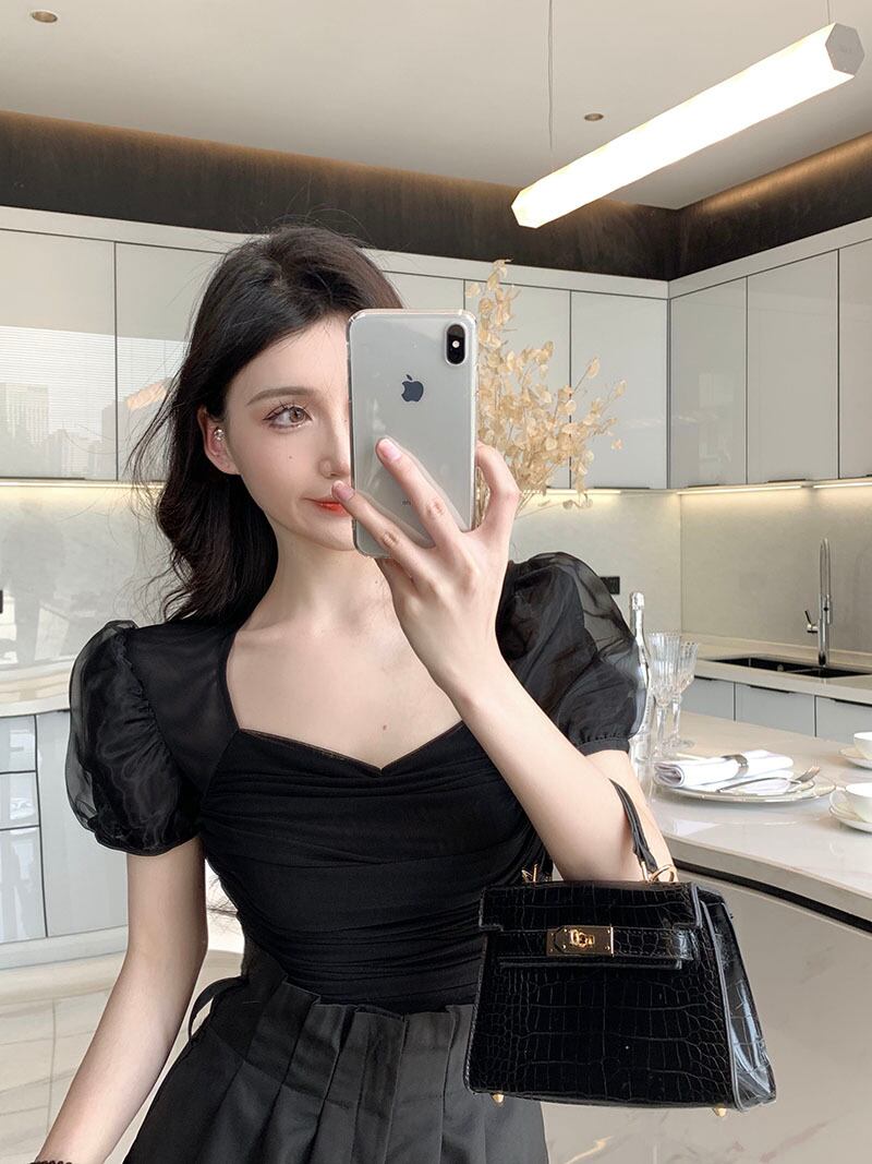 2022 summer new French ladies temperament sexy short square collar sweet puff sleeve mesh t-shirt top women ショート 大人ガーリー スウィート キュート カジュアル サマー 夏物 メッシュ Tシャツ スクウェア nana63958433768 | modepoisson