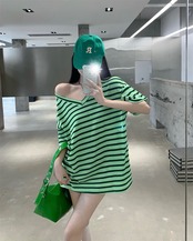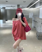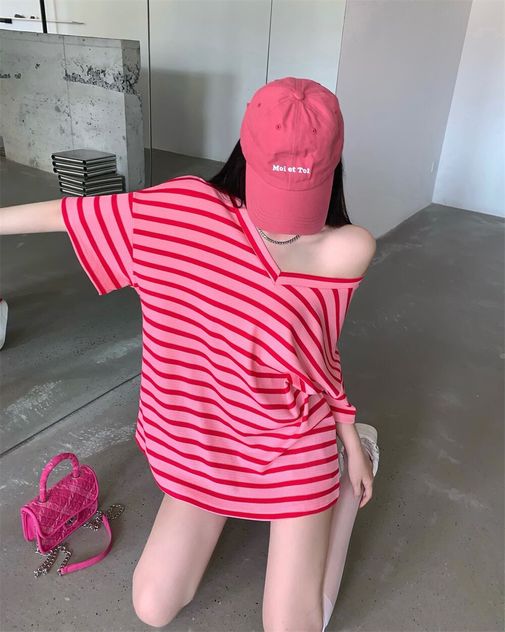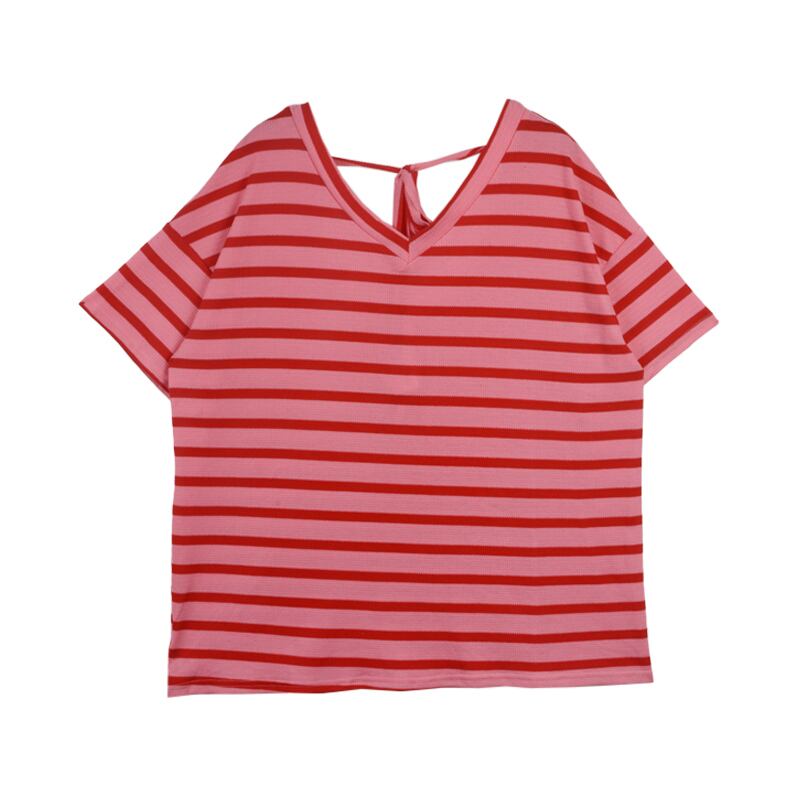 2022 summer new net red popular short-sleeved v-neck striped loose mid-length backless t-shirt top women レッド サマー 夏物 Vネック ストライプ Tシャツ nana28132870227 | modepoisson