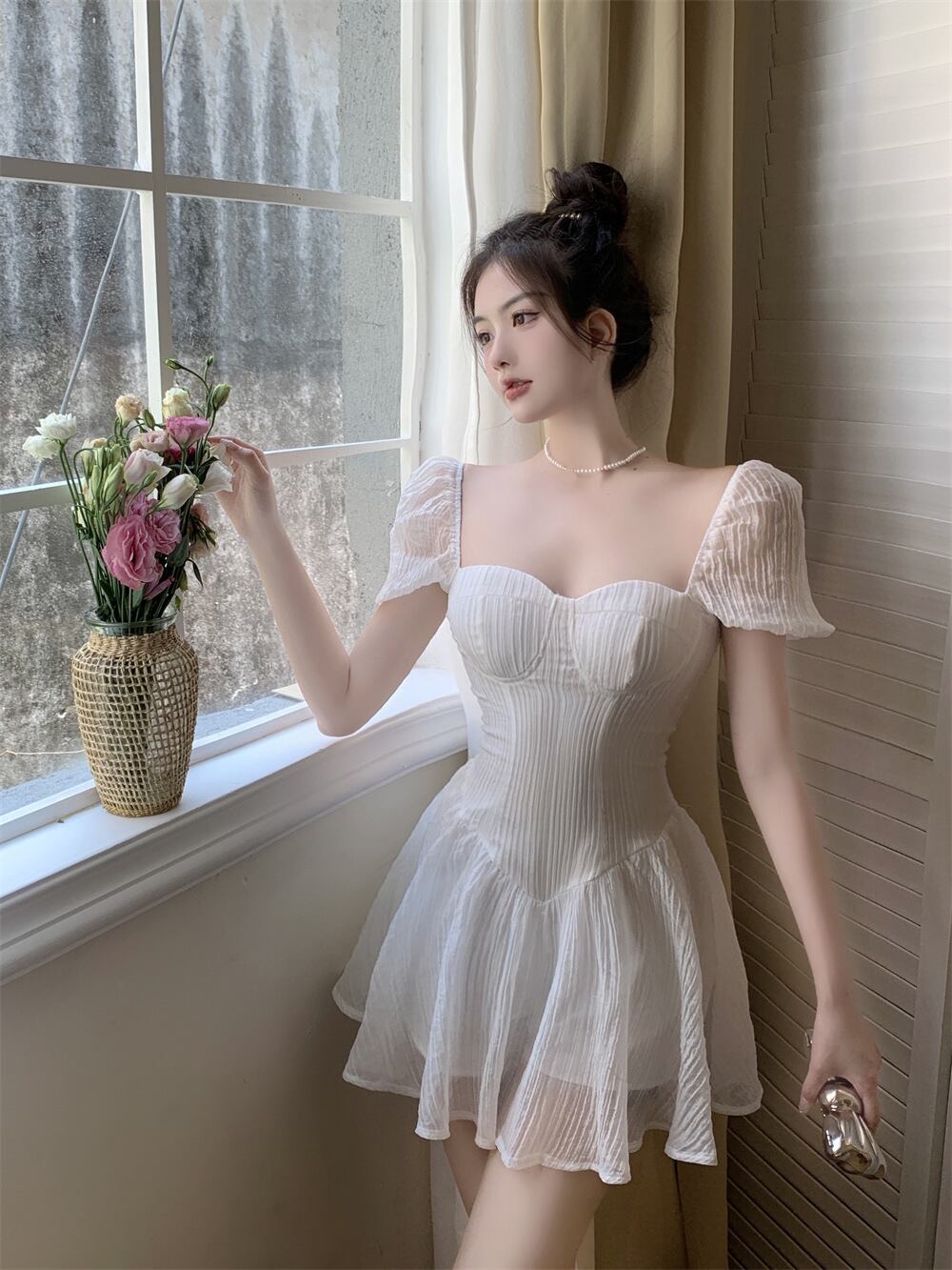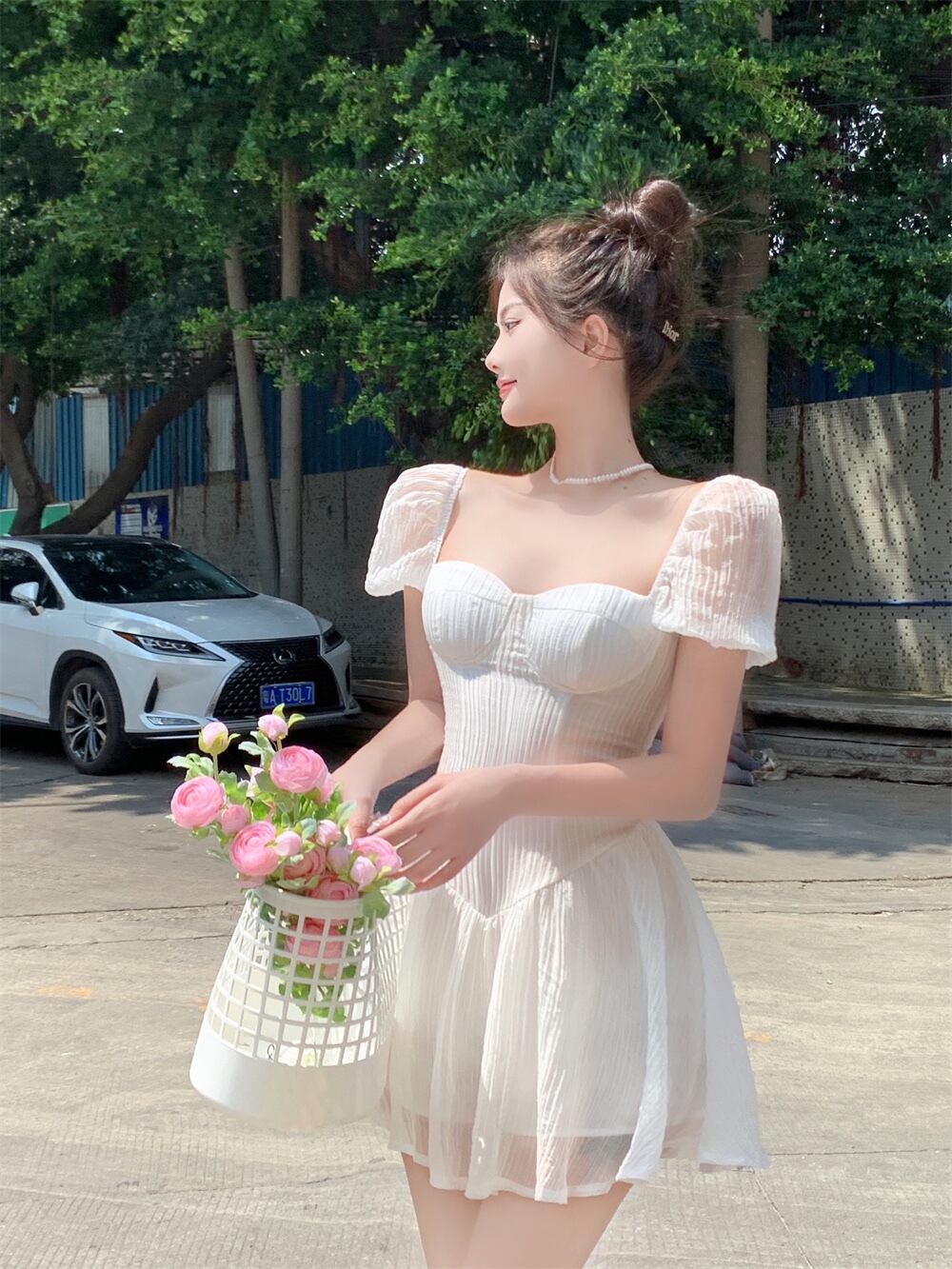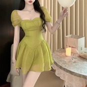 French court style ladies temperament square collar short-sleeved skirt summer high waist slim pleated a-line dress women's ハイウェスト プリーツ サマー 夏物 スカート Aライン スリム スクウェア nana34128269196 | modepoisson