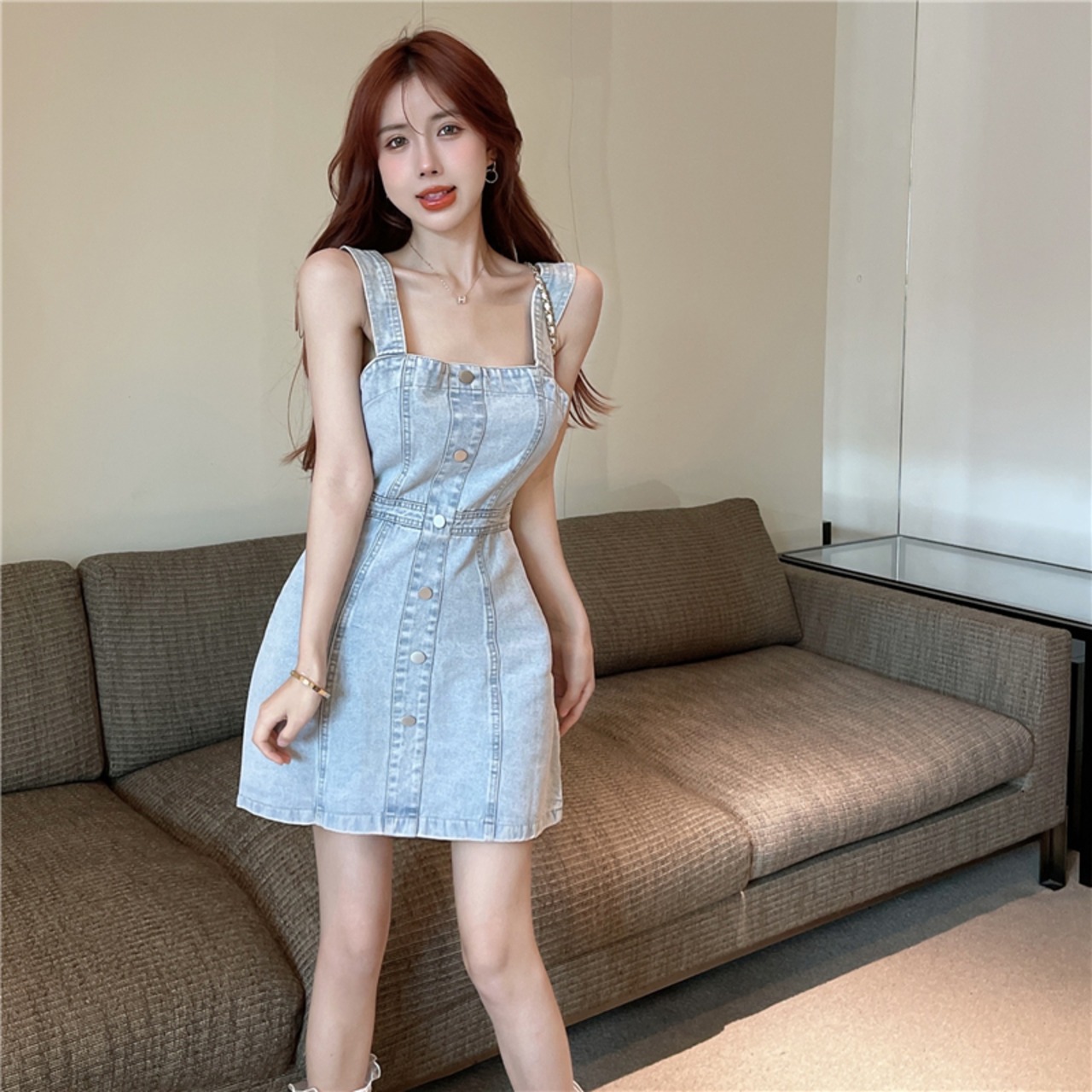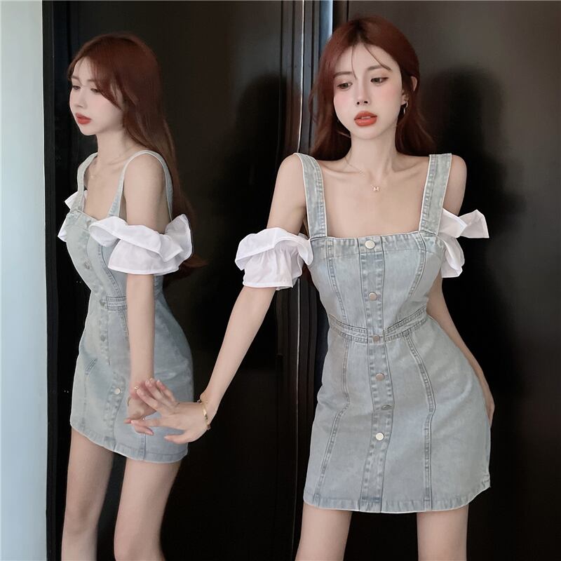 2022 summer new small fresh sexy one-shoulder sweet slim slim denim suspender dress women's 大人ガーリー スウィート キュート カジュアル サマー 夏物 スリム nana3160979576 | modepoisson