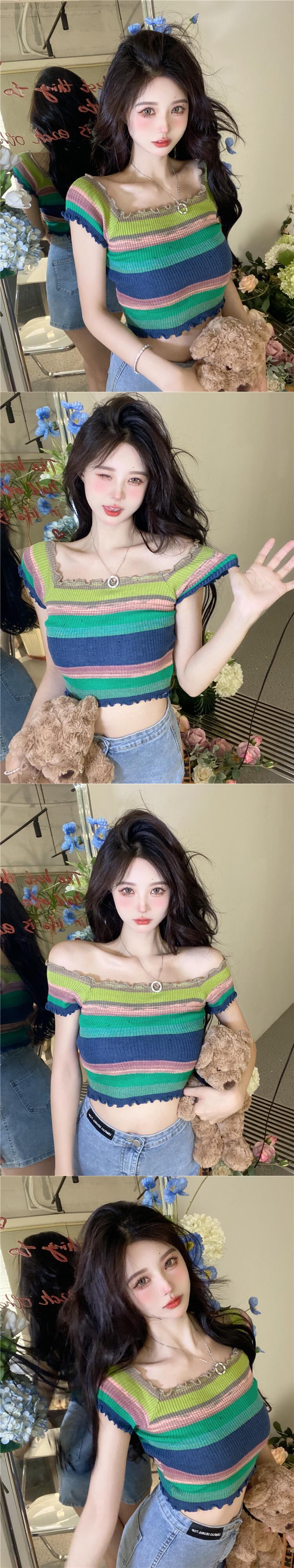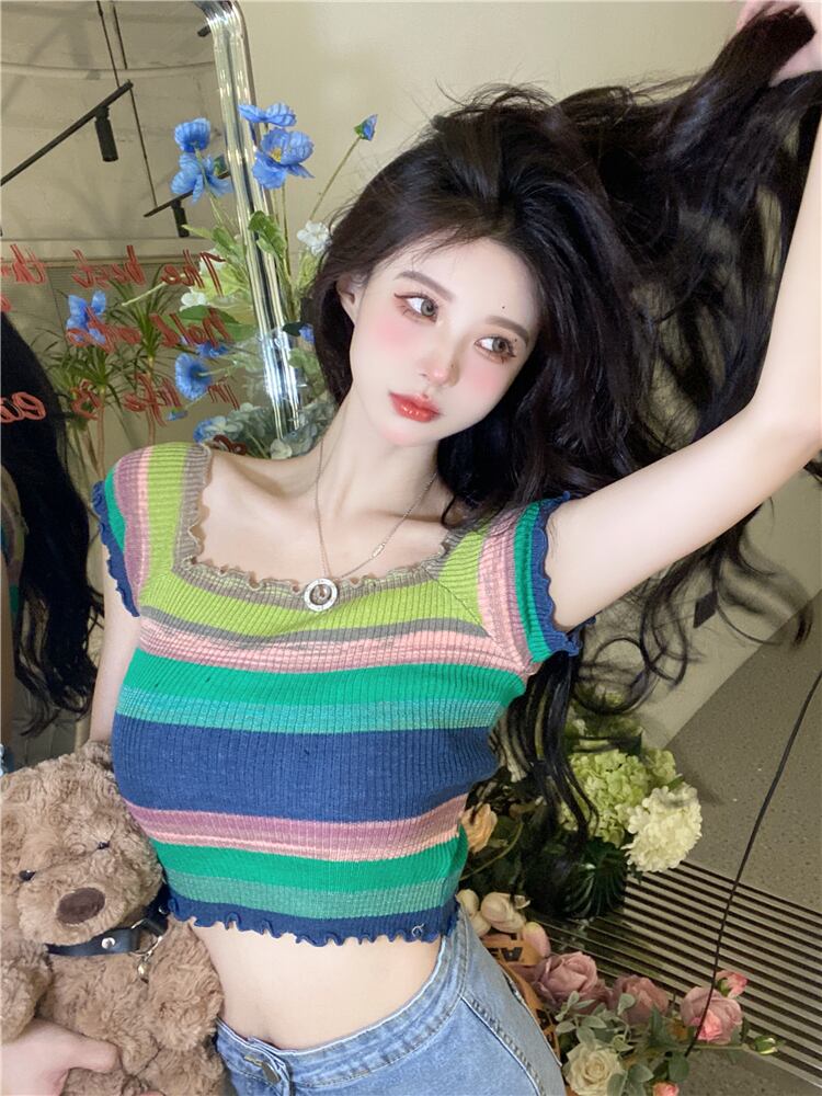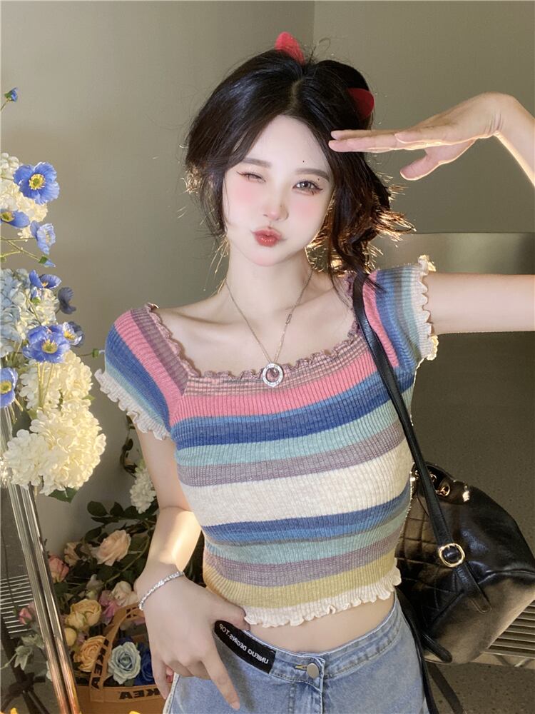 Short-sleeved fungus edge striped t-shirt women's 2022 new design niche chic slim fit short knitted top ショート ストライプ スリム Tシャツ nana10728026604 | modepoisson