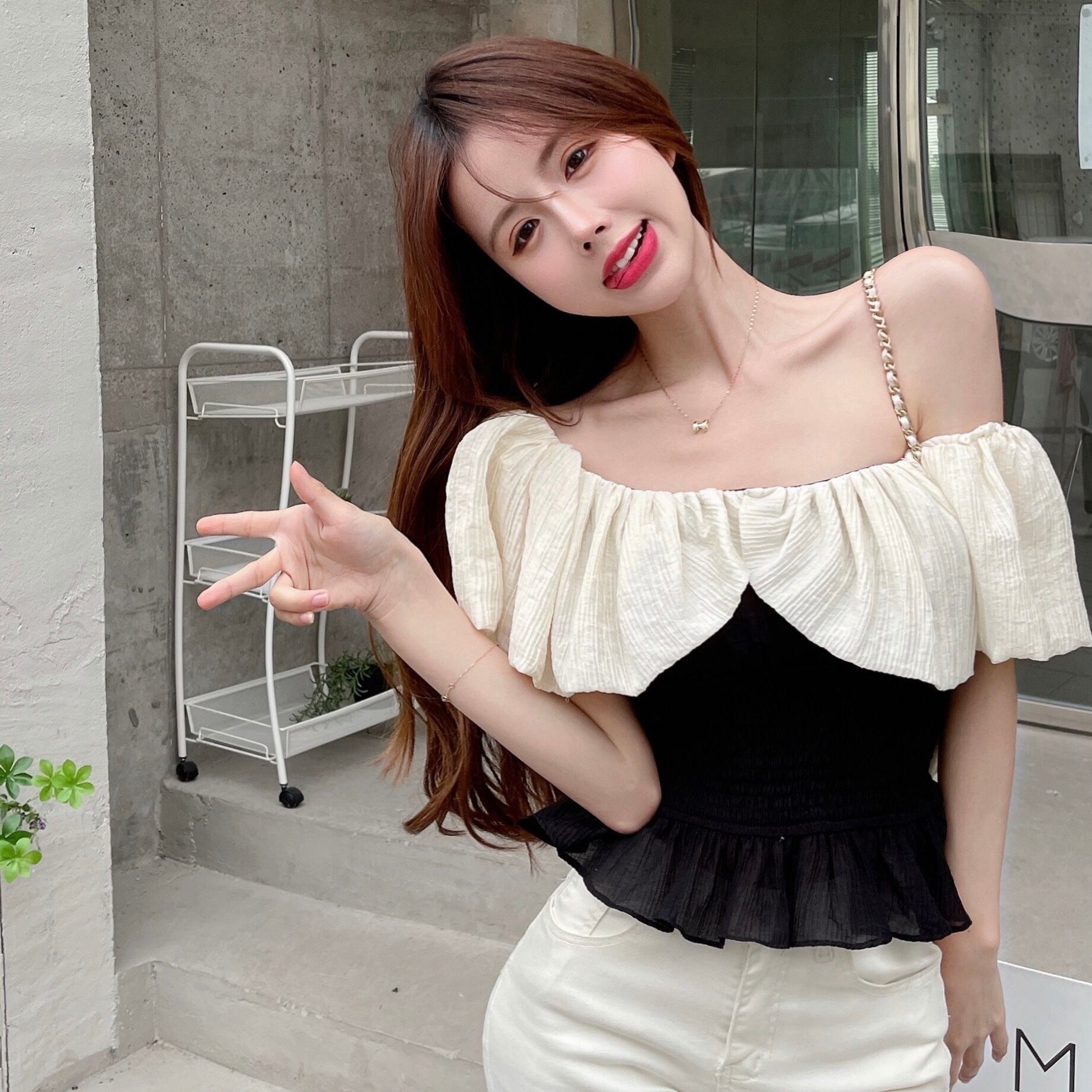 French one-shoulder shirt 2022 summer new design small chic unique ruffle crop top women サマー 夏物 nana14756729884 | modepoisson