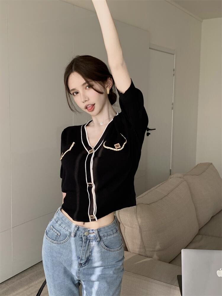 Xiaoxiang celebrity style temperament v-neck puff sleeve knitted sweater 2022 summer new thin cardigan short-sleeved top women カーディガン サマー 夏物 Vネック nana61906381201 | modepoisson