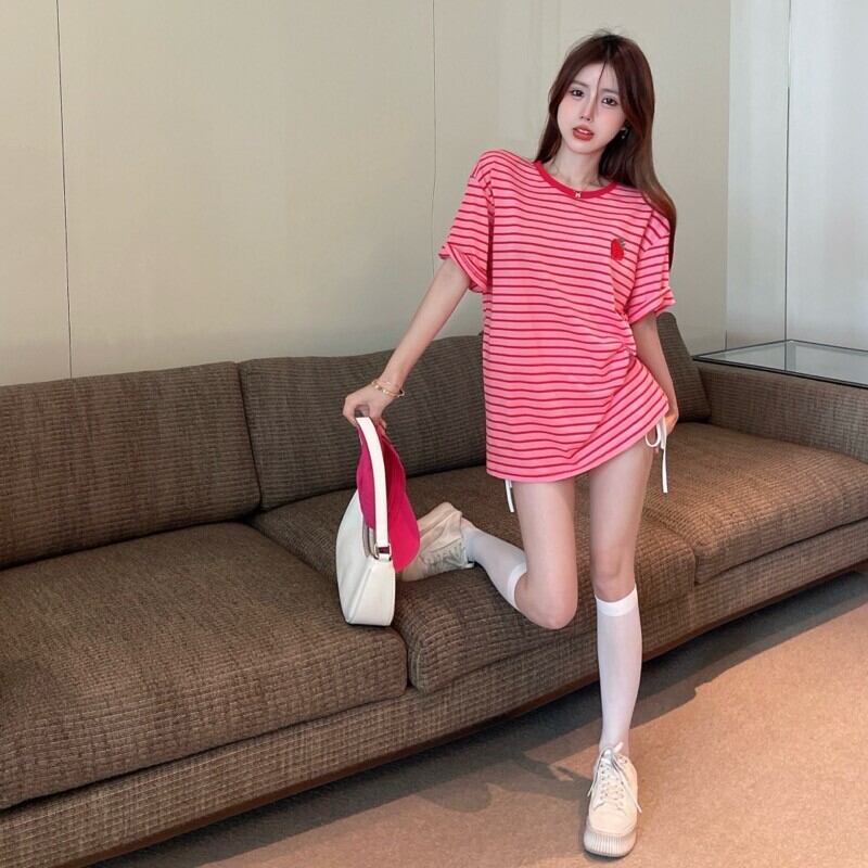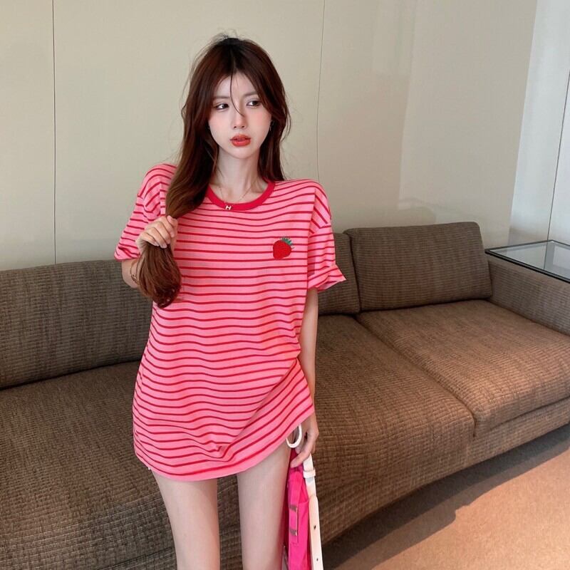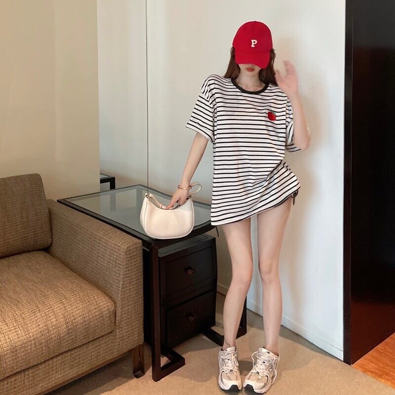 Short-sleeved t-shirt 2022 summer new design sense niche chic loose striped mid-length top women's clothing サマー 夏物 ストライプ Tシャツ nana68172130624 | modepoisson