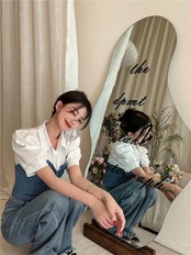 The sense of design is niche, unique, unique, denim stitching, puff sleeves, short shirts, ladies summer French thin tops ショート シャツ サマー 夏物 ステッチ nana14647983048 | modepoisson