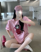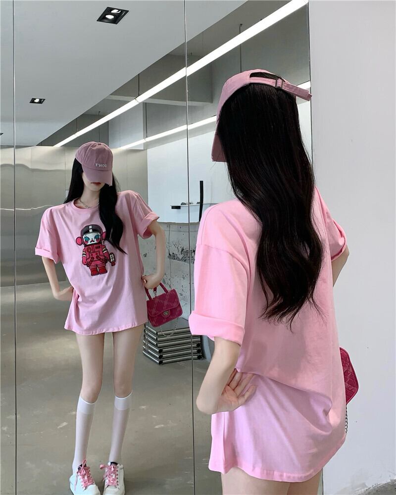 Short-sleeved t-shirt women's ins trend 2022 summer new design niche medium and long loose shoulder pink top ロング ピンク サマー 夏物 Tシャツ nana41228217010 | modepoisson