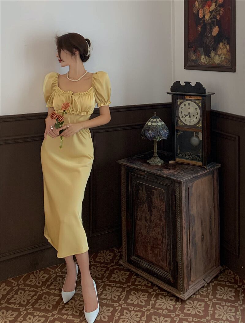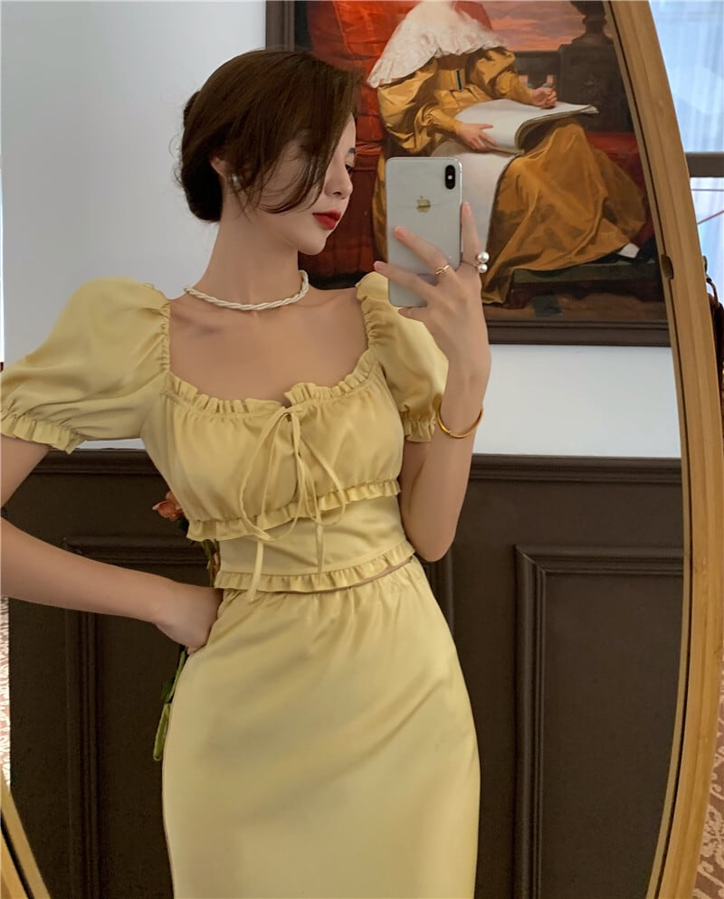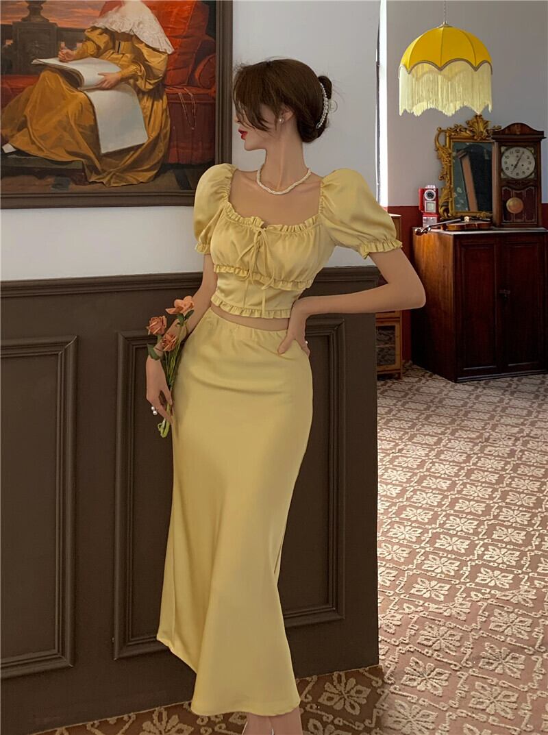 Light cooked style retro puff sleeve top high waist skirt Hong Kong flavor small fragrance summer sweet two-piece suit female ハイウェスト レトロ 大人ガーリー スウィート キュート カジュアル サマー 夏物 スカート nana89889909063 | modepoisson