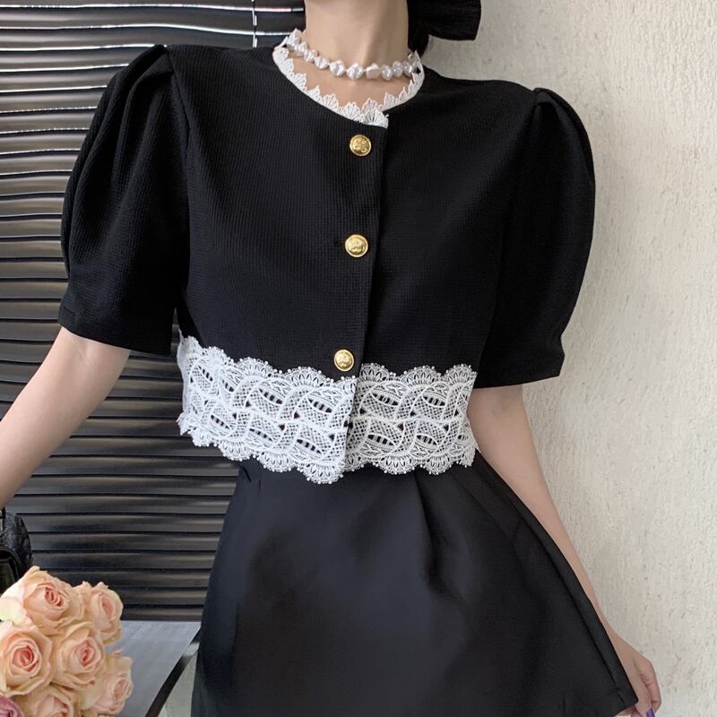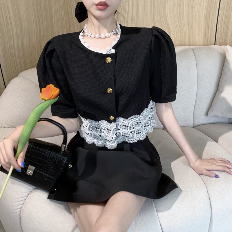 Black Puff Sleeve Shirt 2022 Summer Small Shirt Chic French Short Sleeve Top ショート ブラック 半袖 ハーフスリーブ サマー 夏物 nana99996864930 | modepoisson