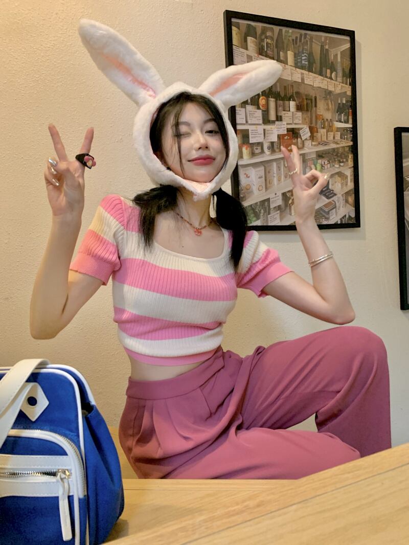 French striped square collar slim short thin sweater 2022 summer new thin short-sleeved t-shirt top women ショート サマー 夏物 ストライプ スリム Tシャツ スクウェア nana71550112327 | modepoisson