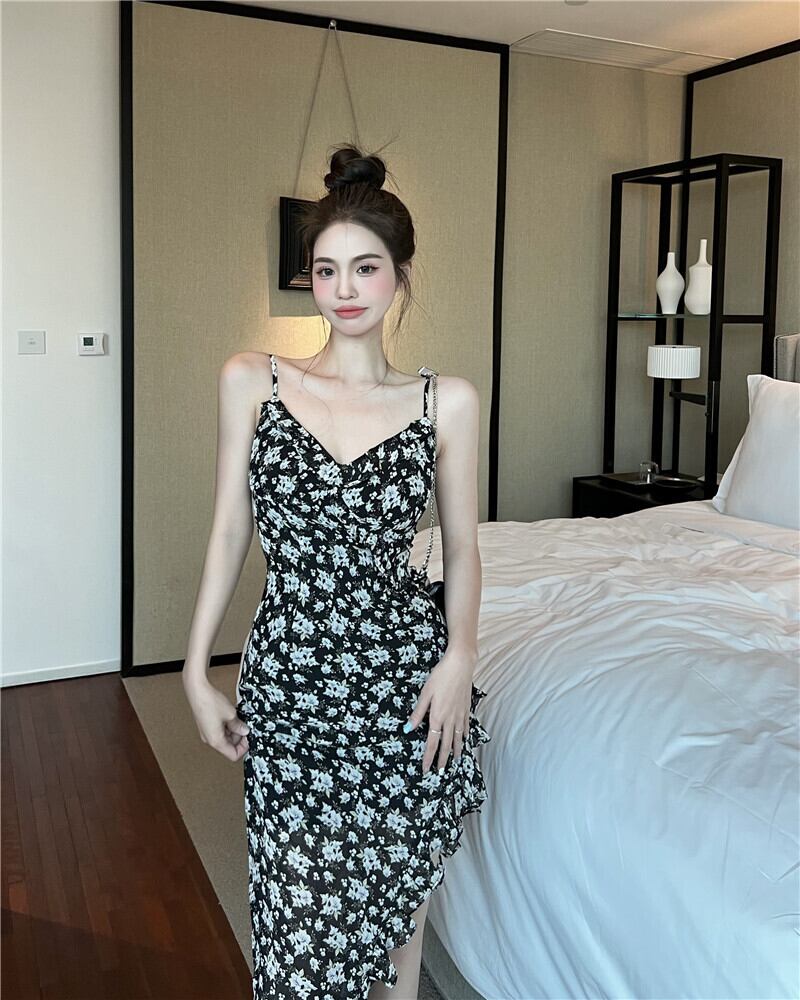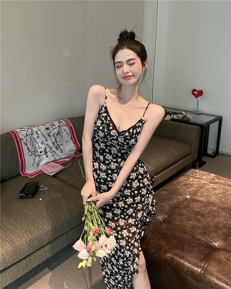 French Hepburn Retro Little Black Dress Unique Floral Skirt Long Split Sling Dress Summer ロング ブラック レトロ サマー 夏物 花柄 スカート nana96440155976 | modepoisson