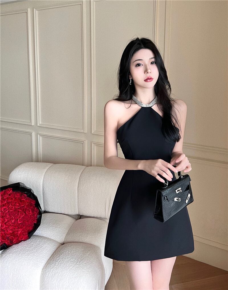 Chic little black skirt 2022 summer new style slimming Yujie backless suspender women's Hepburn style halterneck dress ブラック サマー 夏物 スカート nana97900685197 | modepoisson