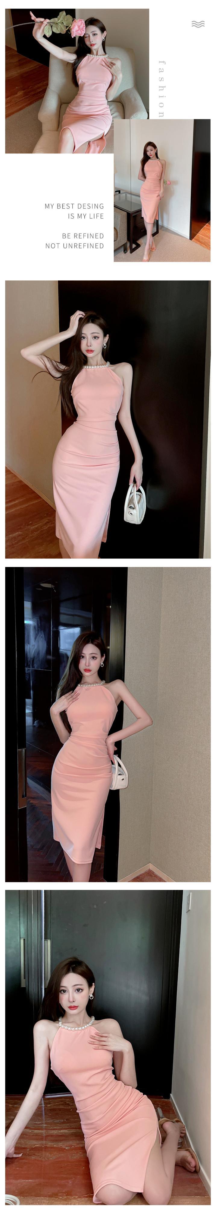 2022 summer new version of the celebrity temperament pearl halter neck off-shoulder mid-length black slit dress women's ブラック サマー 夏物 オフショルダー パール 真珠 nana67526556878 | modepoisson