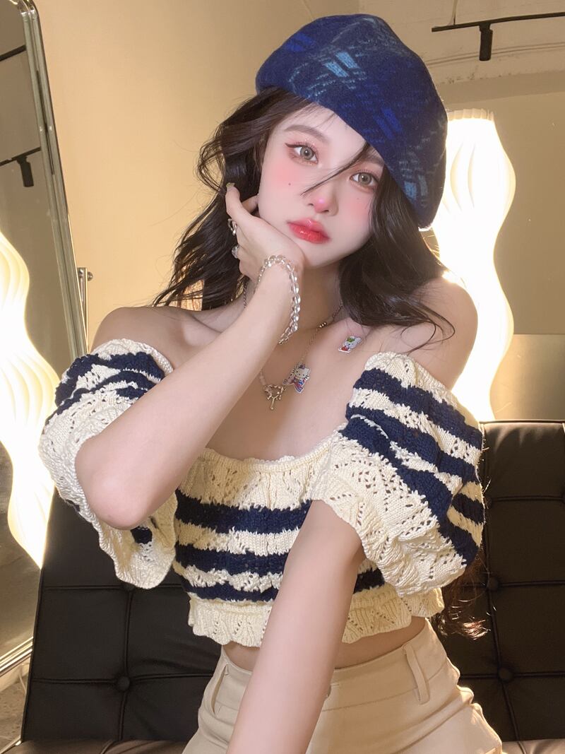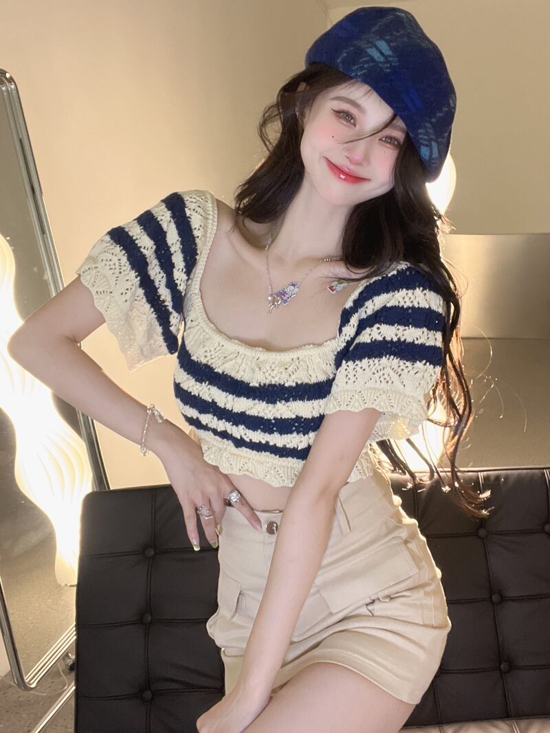 Short knitted sweater women's summer 2022 new retro chic black and white striped square collar short-sleeved hollow high-waisted top ショート ホワイト ブラック レトロ サマー 夏物 ストライプ スクウェア nana3082543049 | modepoisson