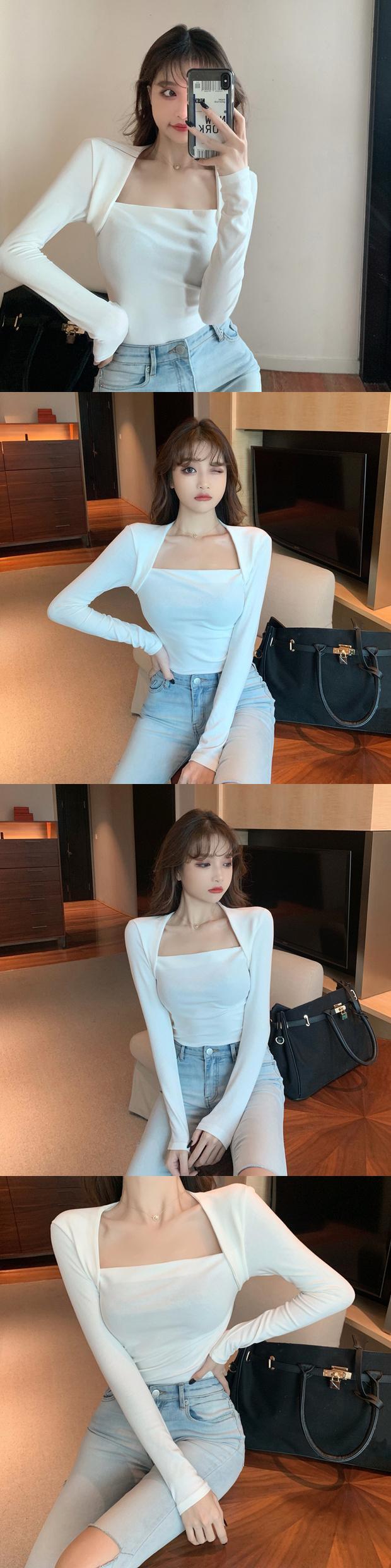 Be careful machine revealing collarbone bottoming shirt square collar top women's 2022 new spring and autumn tight-fitting short t-shirt ショート スプリング 春物 オータム 秋物 Tシャツ スクウェア nana8578914828 | modepoisson