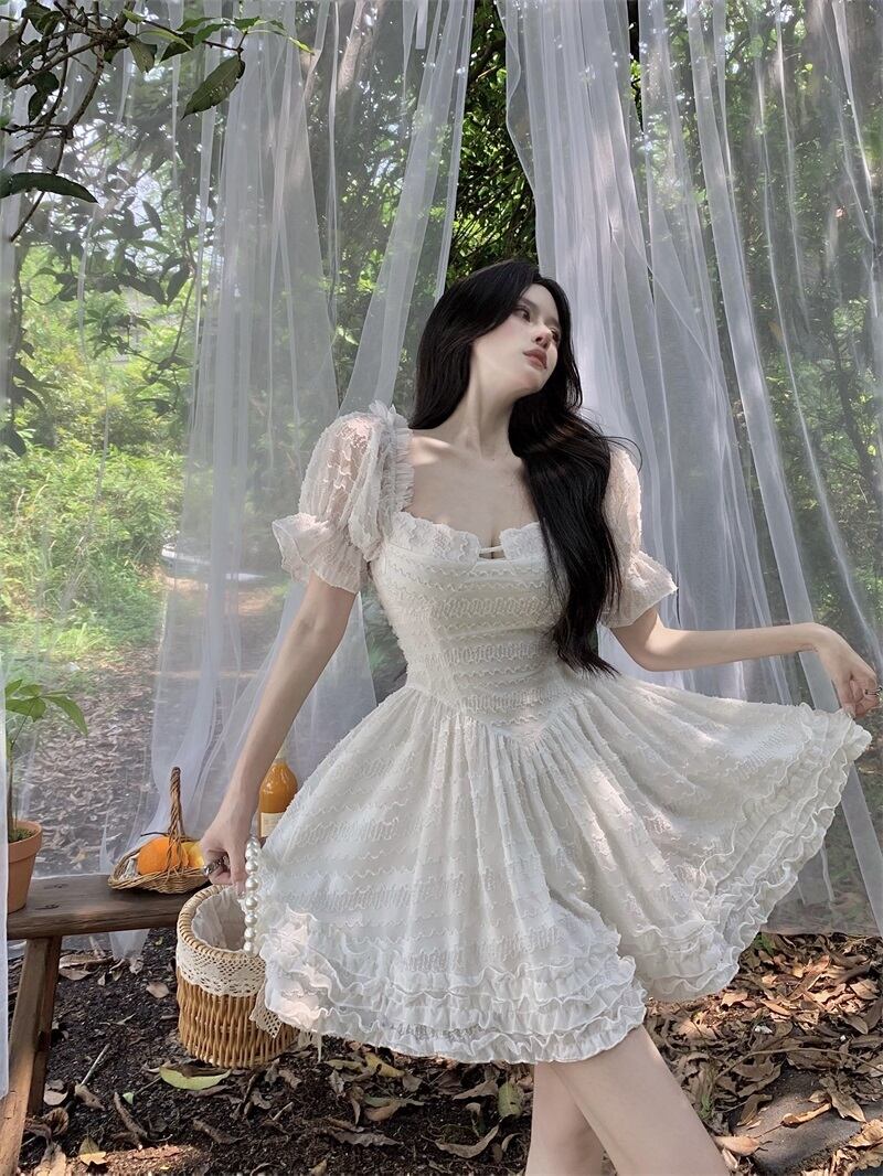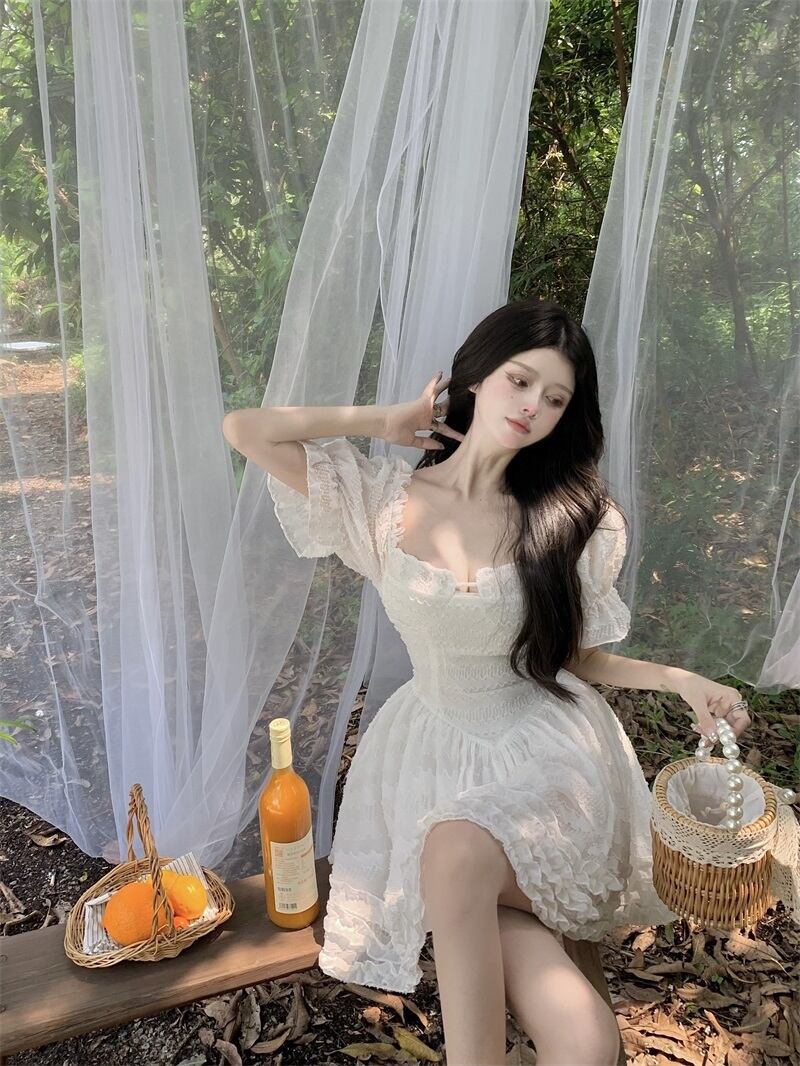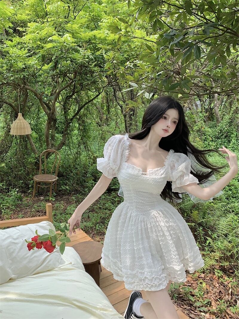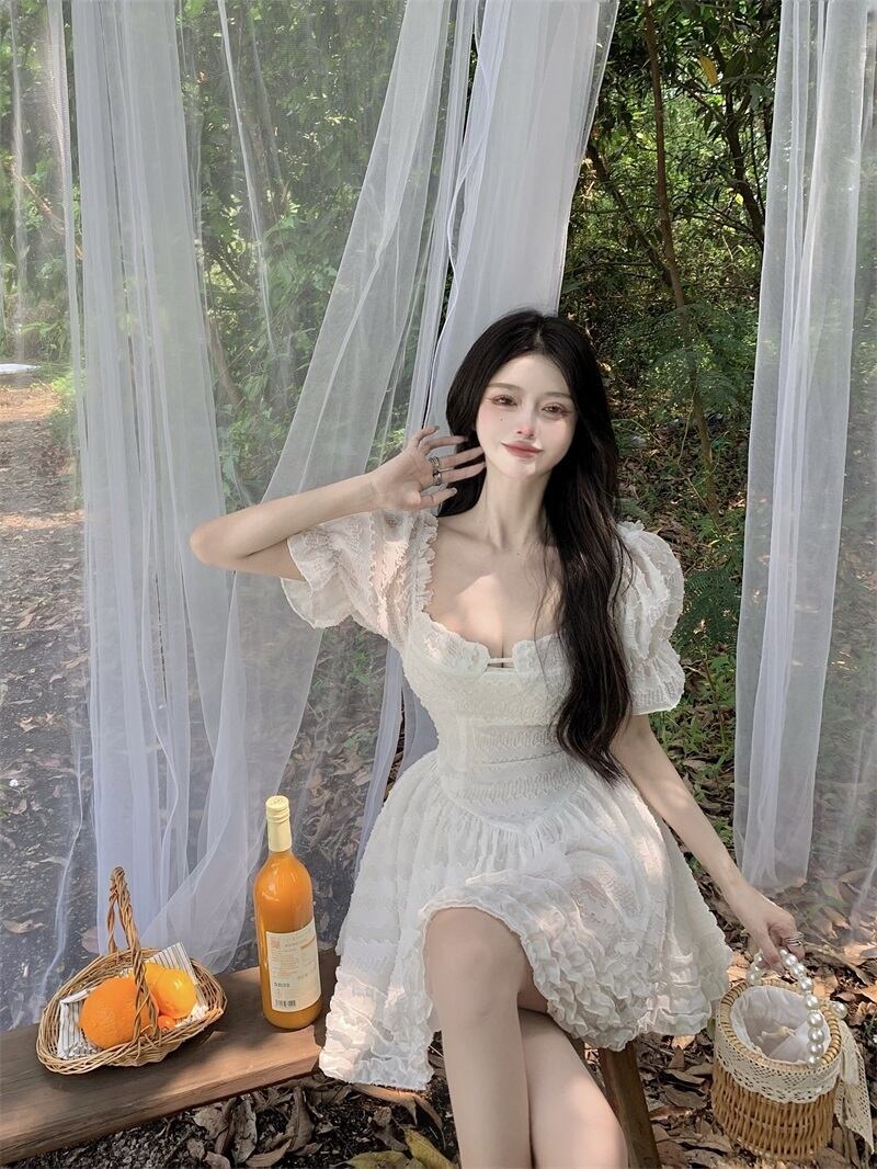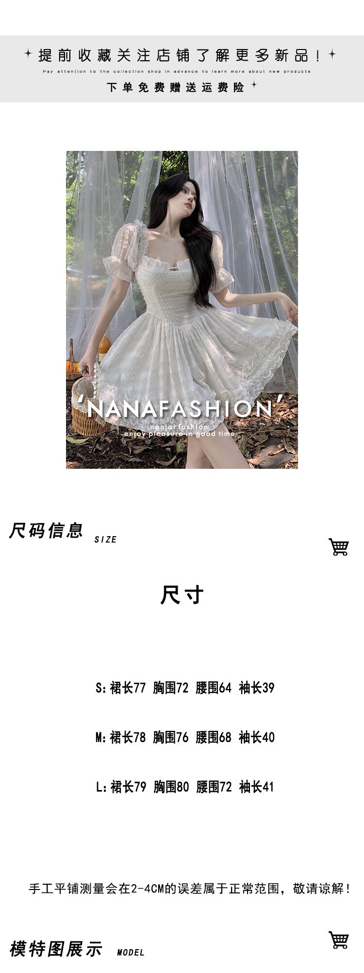 French ladies temperament design sense niche summer new skirt waist is thin square neck puff sleeve dress female サマー 夏物 スカート スクウェア nana36251814423 | modepoisson