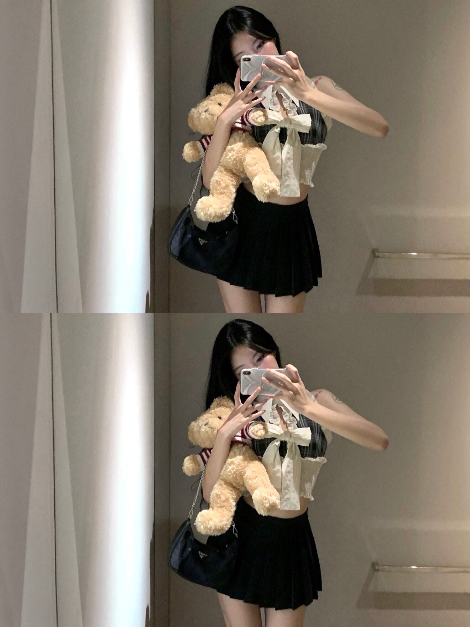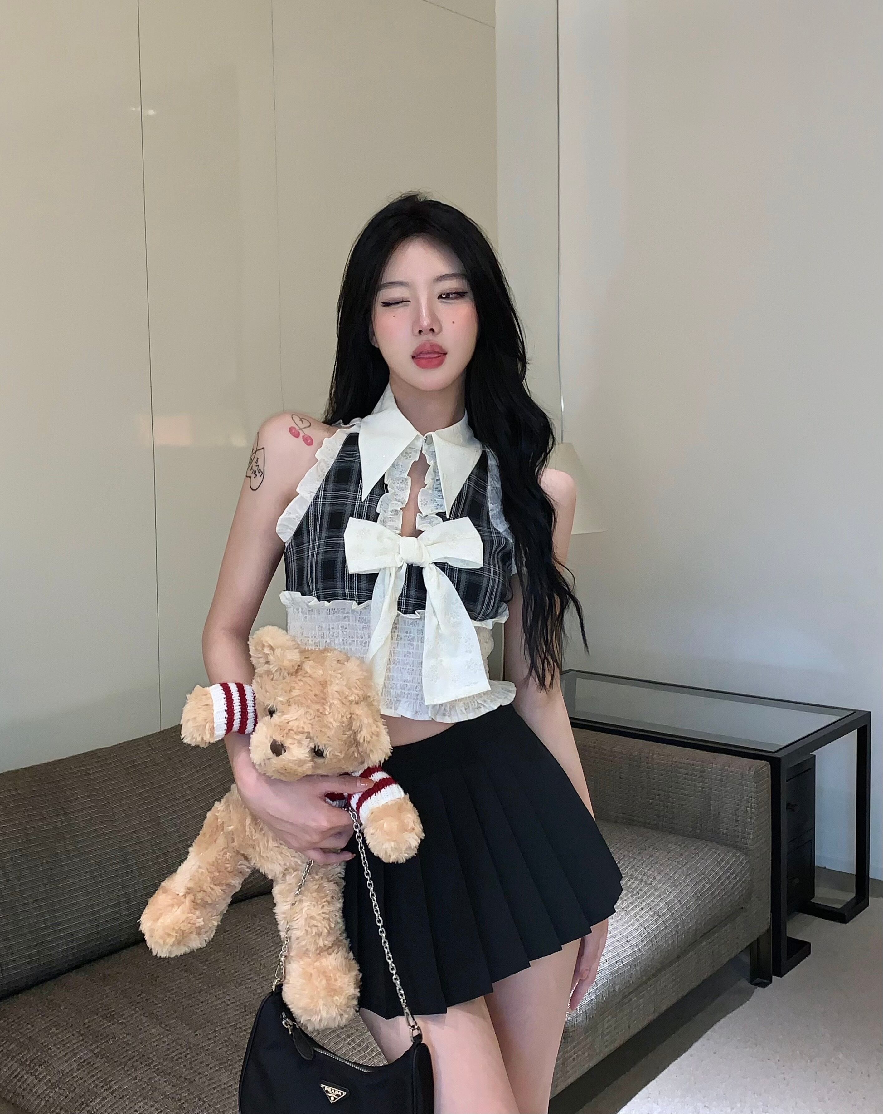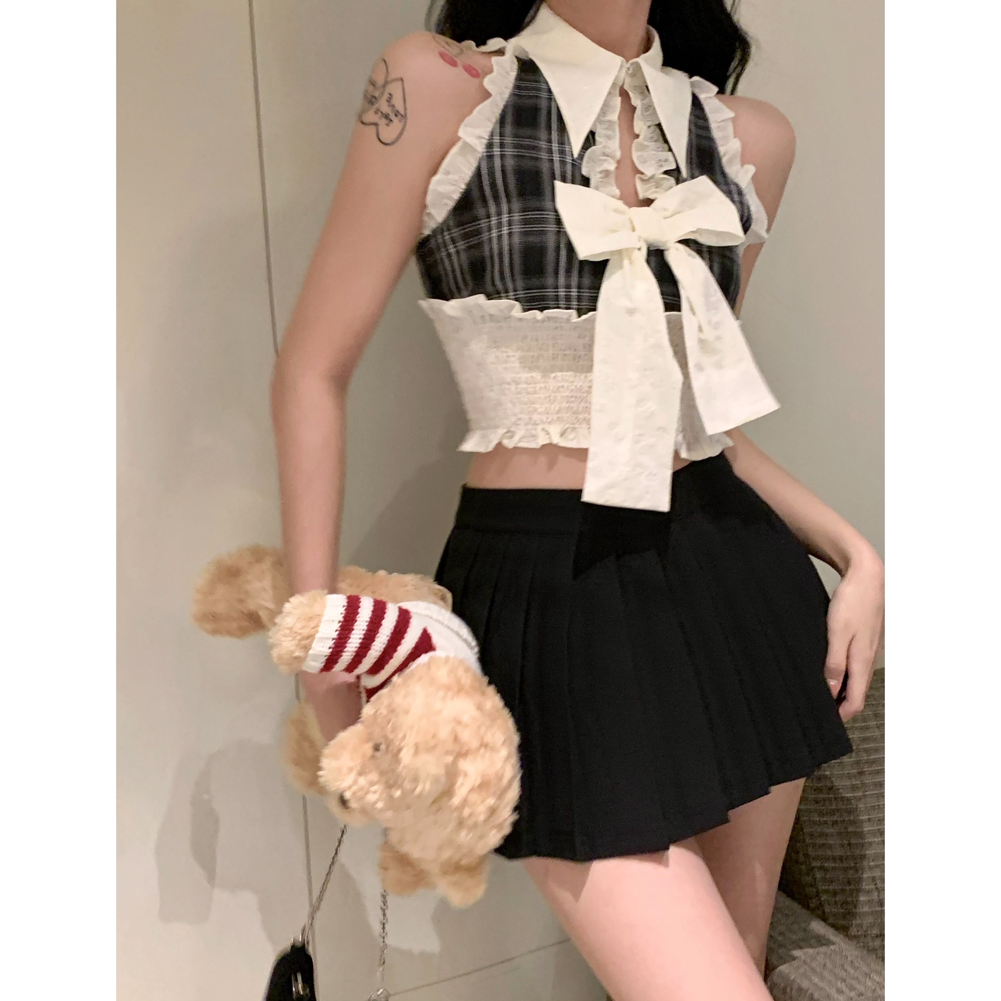 American retro suit 2022 summer new bow vest pleated skirt Royal sister fried street two-piece female リボン レトロ ストリート プリーツ サマー 夏物 スカート nana31998530045 | modepoisson