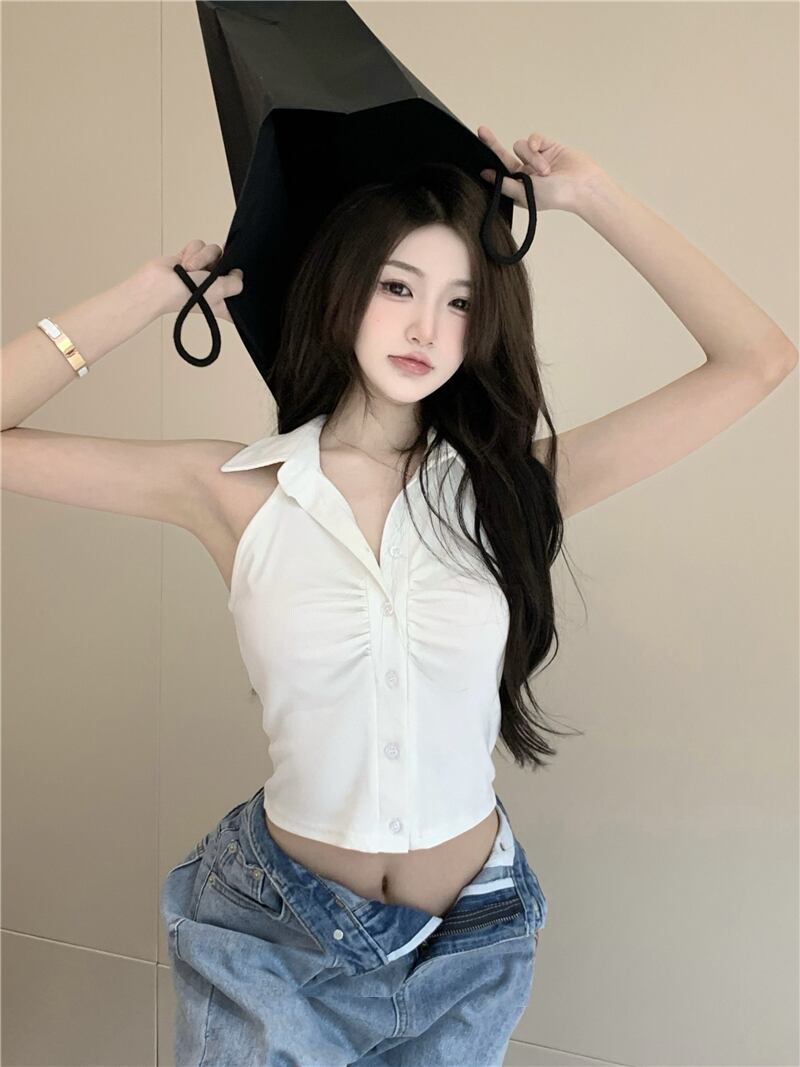Vest women's summer wear Hong Kong style POLO collar slim fit lapel folded short sleeveless top trendy ショート 半袖 ハーフスリーブ サマー 夏物 ノースリーブ スリム nana28199491928 | modepoisson