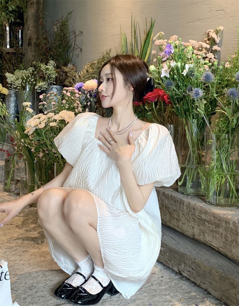 French gentle wind sweet fluffy skirt 2022 summer new chic stunning square neck puff sleeve dress women 大人ガーリー スウィート キュート カジュアル ふわふわ サマー 夏物 スカート スクウェア nana81317404243 | modepoisson