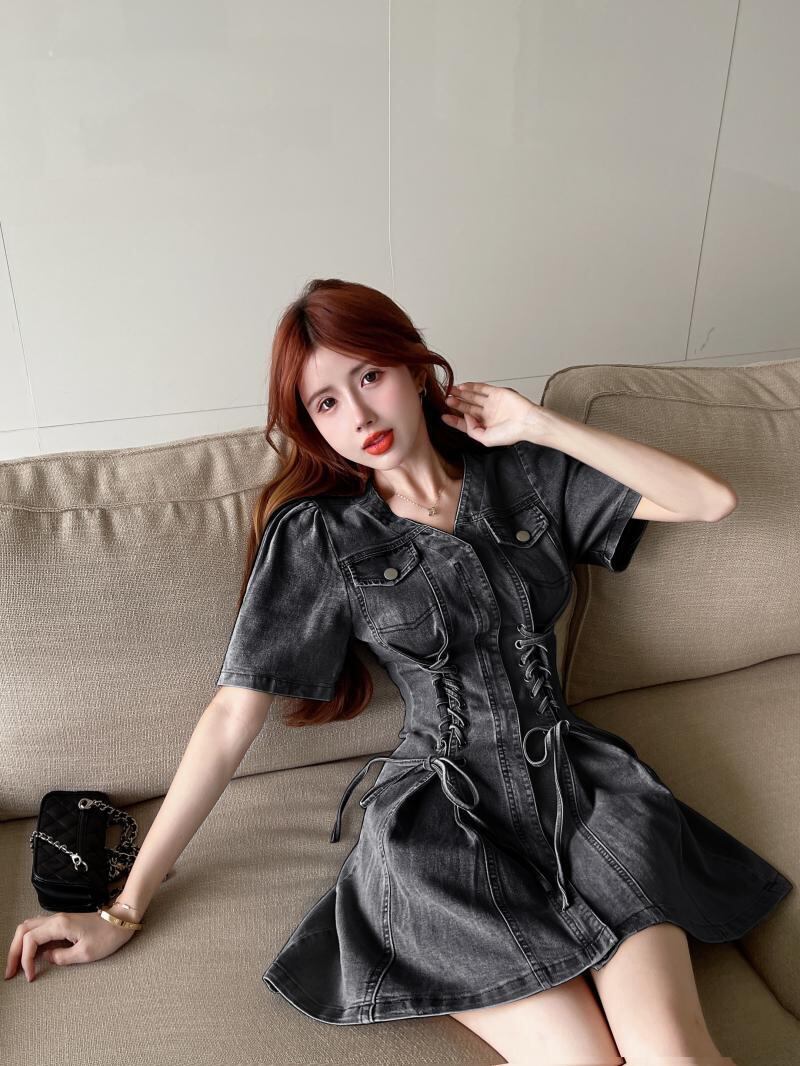 Summer skirt French design sense niche v-neck puff sleeves drawstring temperament waist slim denim dress women サマー 夏物 スカート Vネック スリム nana15039982642 | modepoisson