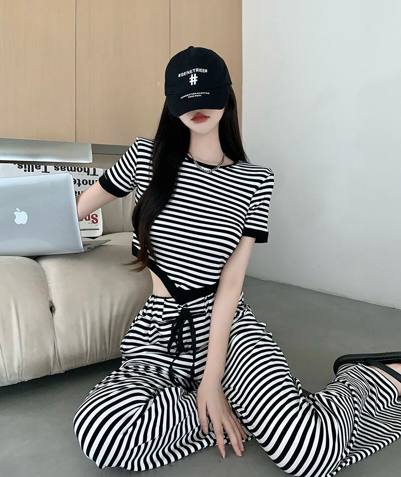 2022 summer age reduction two-piece suit women's new fashion temperament striped t-shirt high waist wide leg pants summer dress ハイウェスト サマー 夏物 ストライプ ワイドレッグ ワイドパンツ Tシャツ nana60567625154 | modepoisson