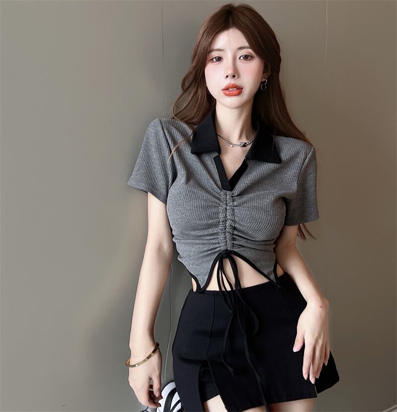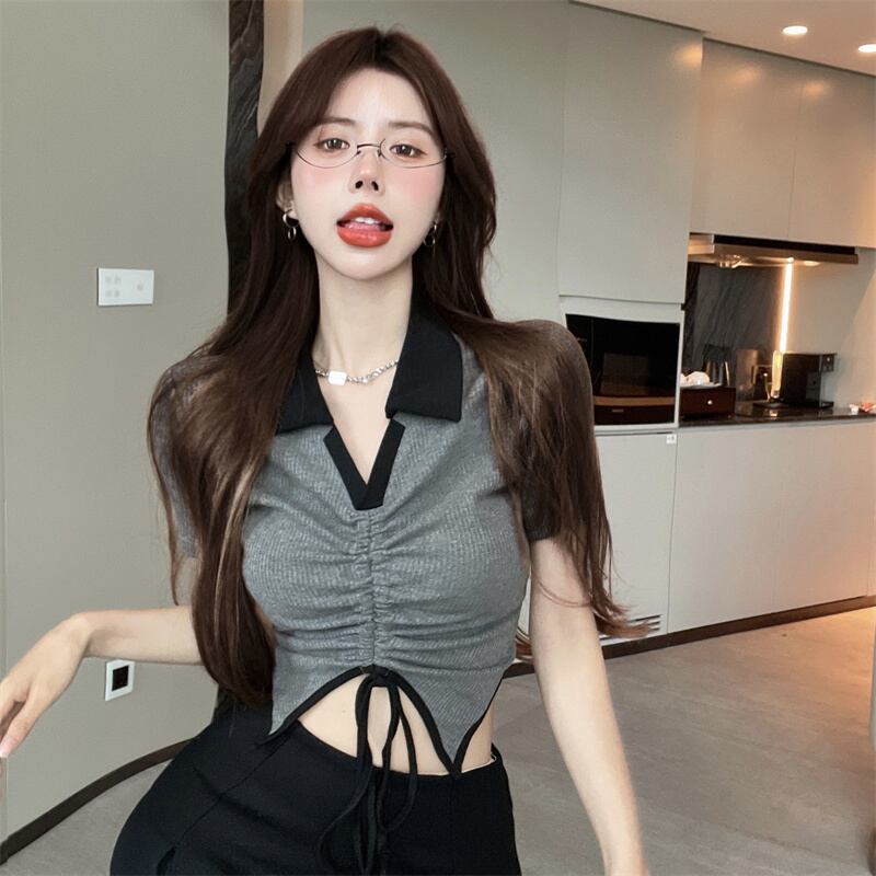 Polo collar irregular drawstring slim v-neck short-sleeved t-shirt women's 2022 summer new slim top サマー 夏物 Vネック スリム Tシャツ nana20705756752 | modepoisson