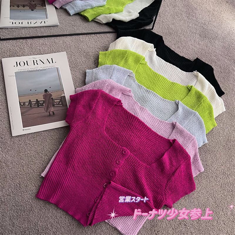 Thin square-neck short-sleeved sweater 2022 summer new sweet and spicy short t-shirt women's fruit green slim top ショート 大人ガーリー スウィート キュート カジュアル サマー 夏物 スリム Tシャツ グリーン スクウェア nana28430363572 | modepoisson