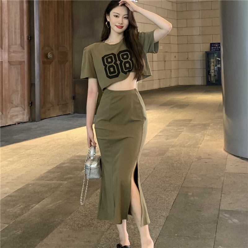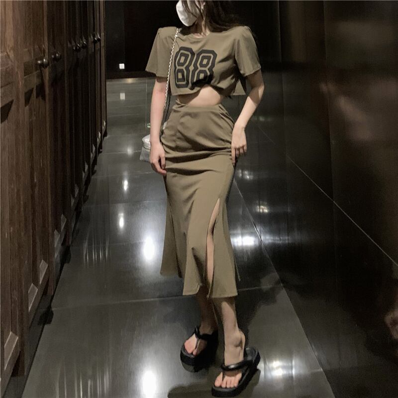 Western style fried street suit women's summer 2022 new navel t-shirt high waist split fishtail skirt two-piece set ハイウェスト ストリート サマー 夏物 スカート Tシャツ nana37251854377 | modepoisson