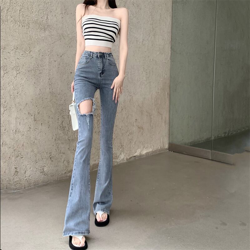 -waisted hole stretch design sense niche pants summer thin wide-leg micro-flare mopping denim trousers women's tide サマー 夏物 nana8987725774 | modepoisson