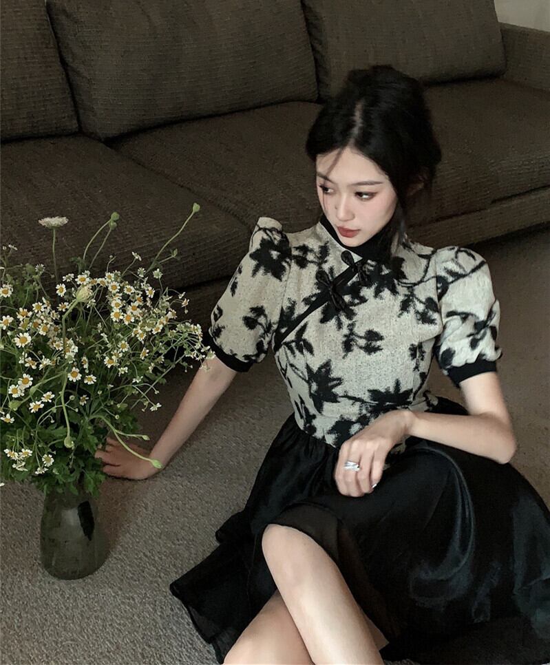 French high-end retro improved cheongsam puff sleeve skirt summer new waist slim Chinese dress female レトロ サマー 夏物 スカート スリム nana88319023483 | modepoisson