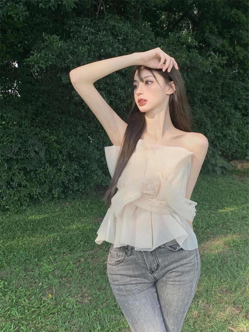 Chiffon tube top suspenders women's summer design sense niche French pure desire wind sweet and spicy outer wear one-shoulder vest top シフォン 大人ガーリー スウィート キュート カジュアル サマー 夏物 ピュア nana32077394504 | modepoisson