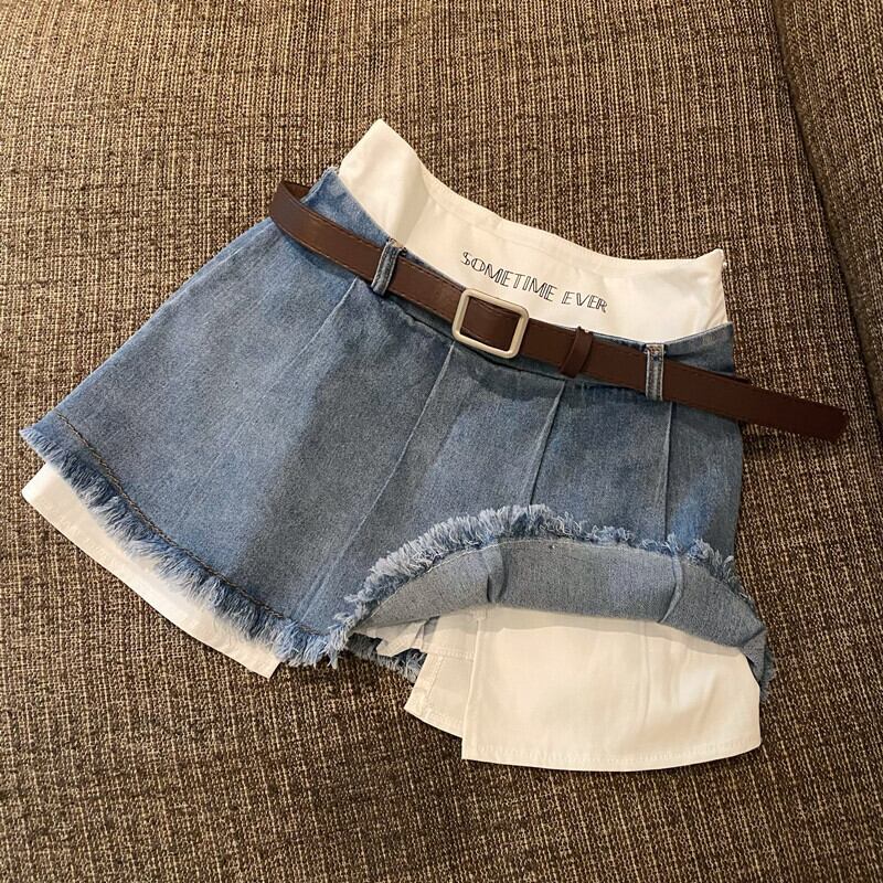 Hot retro denim skirt irregular fake two-piece miniskirt pleated skirt female 2022 summer new skirt レトロ プリーツ サマー 夏物 スカート nana81417090136 | modepoisson