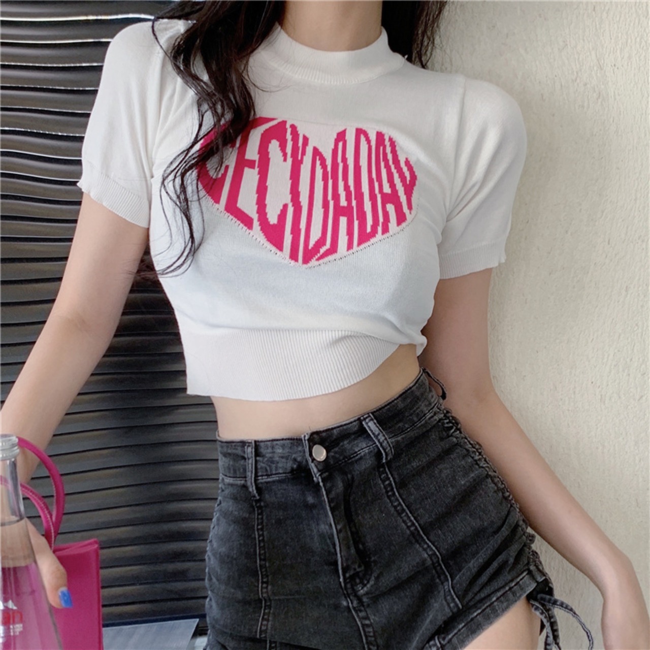 White short-sleeved knitted t-shirt women's 2022 summer new love BM slim fit and thin short top ショート ホワイト サマー 夏物 スリム Tシャツ nana31659411822 | modepoisson
