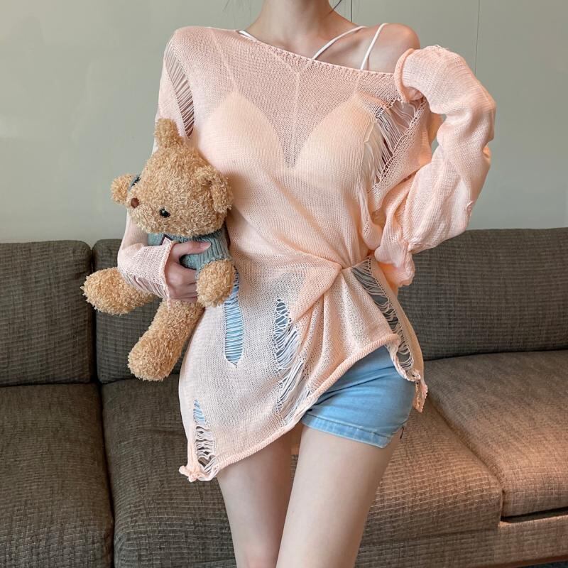 NN Nana~ Hollow Hollow Knit Sweater Women's Sunscreen Thin Section Summer Explosive Loose French Long Sleeve Top ロング 長袖 サマー 夏物 nana16732088228 | modepoisson