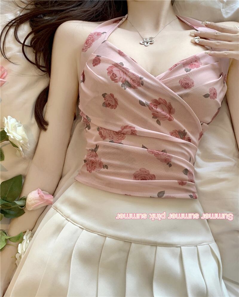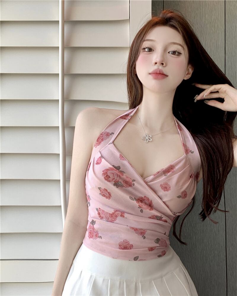 Halter neck camisole women's summer French niche temperament sexy outer wear short section with floral top ショート サマー 夏物 花柄 nana36530325041 | modepoisson