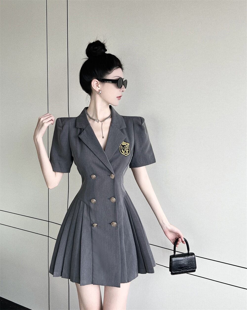 French Hepburn Style Fried Street Royal Sister Fan Lapel Short Sleeves Double Breasted Waist Pleated Suit Dress Women ショート 半袖 ハーフスリーブ ストリート プリーツ nana97806618168 | modepoisson