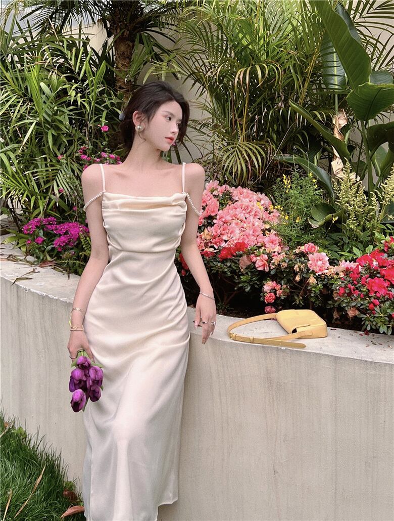 2022 summer new French retro royal sister fan temperament waist slim pearl sling long dress women ロング レトロ サマー 夏物 スリム パール 真珠 nana8121099432 | modepoisson