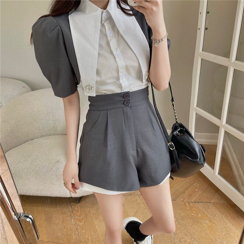 Net red fried street two-piece suit female 2022 summer new fashion temperament puff sleeve top casual wide-leg shorts レッド カジュアル ストリート サマー 夏物 ショーツ ブルマー nana18423788831 | modepoisson