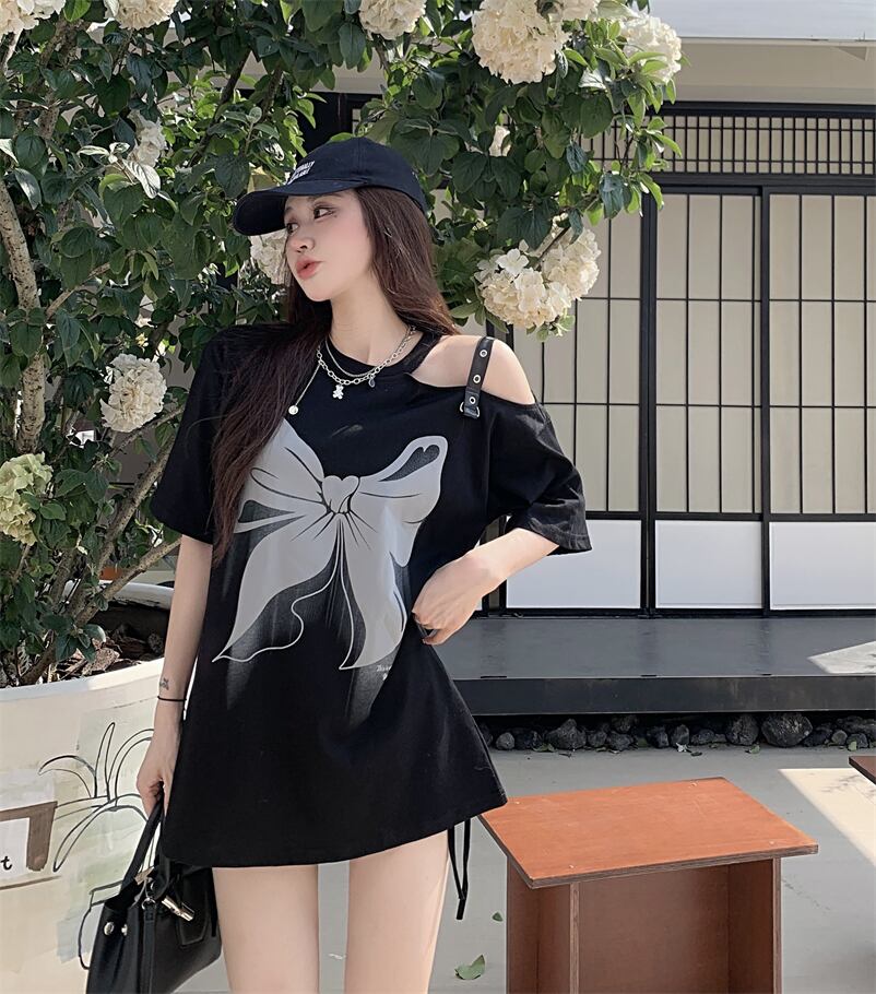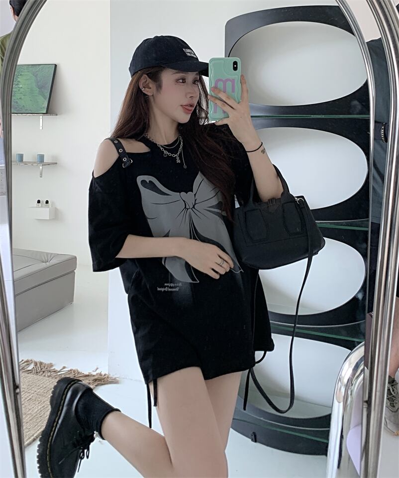 Black design niche chic sexy hollow top 2022 summer new short-sleeved off-the-shoulder t-shirt women's clothing ブラック サマー 夏物 Tシャツ nana87061373749 | modepoisson