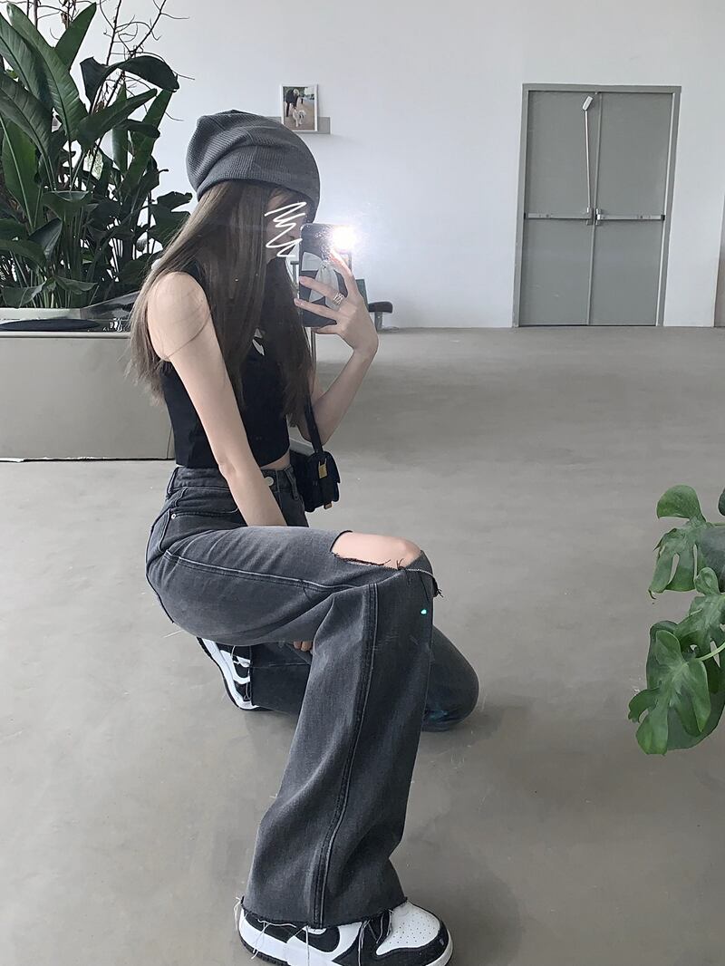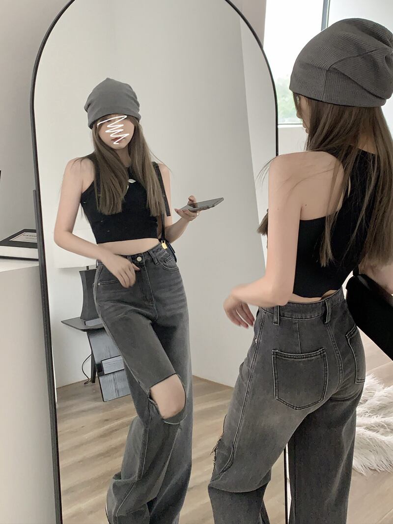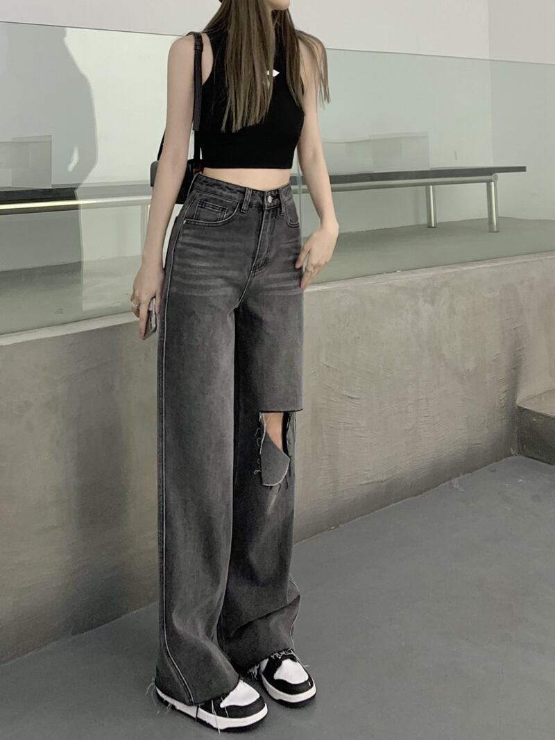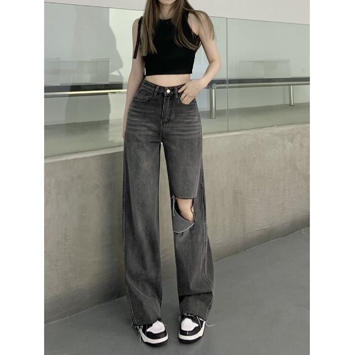 Gray high waist ripped jeans women's summer 2022 new thin section loose and thin straight mopping pants ハイウェスト サマー 夏物 nana81988102544 | modepoisson