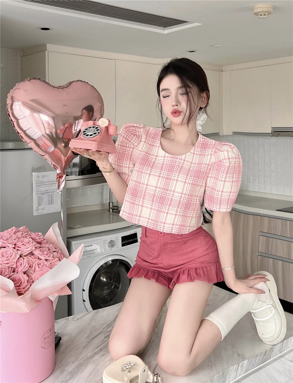 Pink suit women's 2022 summer new puff sleeves plaid French short-sleeved tops are thin and bud casual shorts ピンク カジュアル サマー 夏物 ショーツ ブルマー nana83333024590 | modepoisson