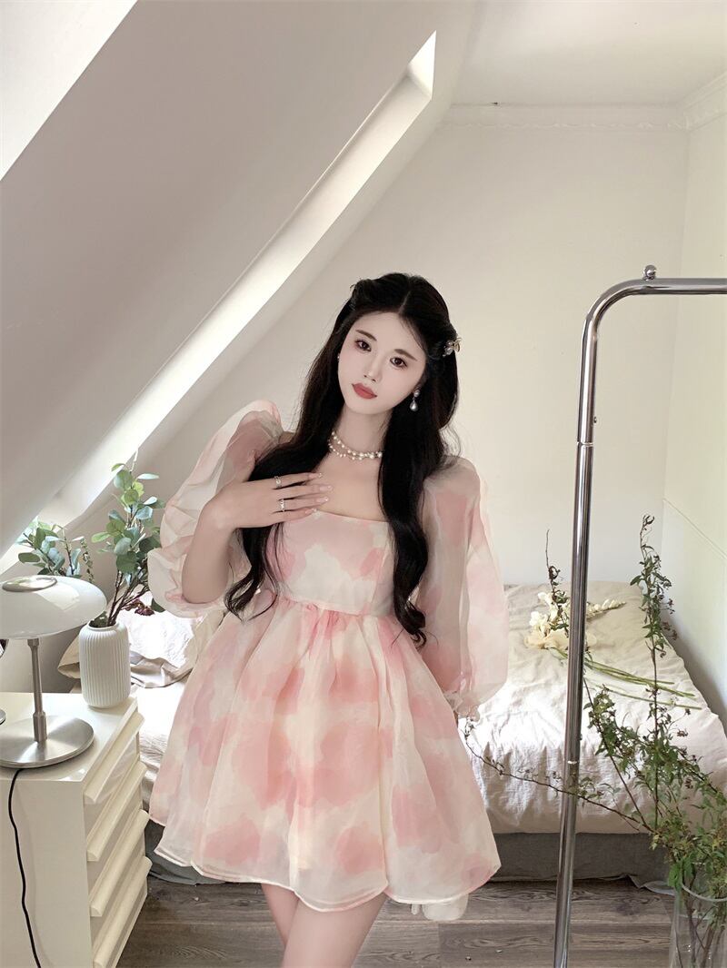 In escape princess style French square collar pink sweet skirt women's summer gentle puff sleeves waist puffy dress ピンク 大人ガーリー スウィート キュート カジュアル サマー 夏物 スカート スクウェア nana3956832005 | modepoisson