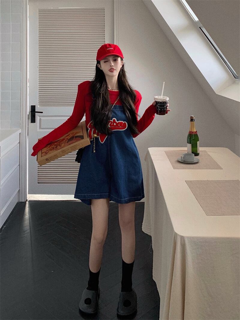 age-reducing temperament two-piece suit female 2022 summer new denim straps wide-leg shorts sunscreen sweater サマー 夏物 ショーツ ブルマー nana68661739752 | modepoisson