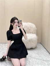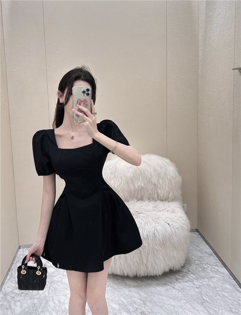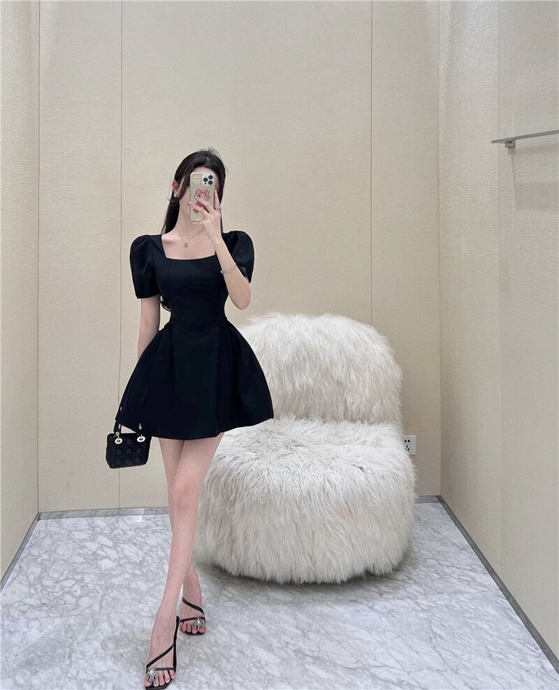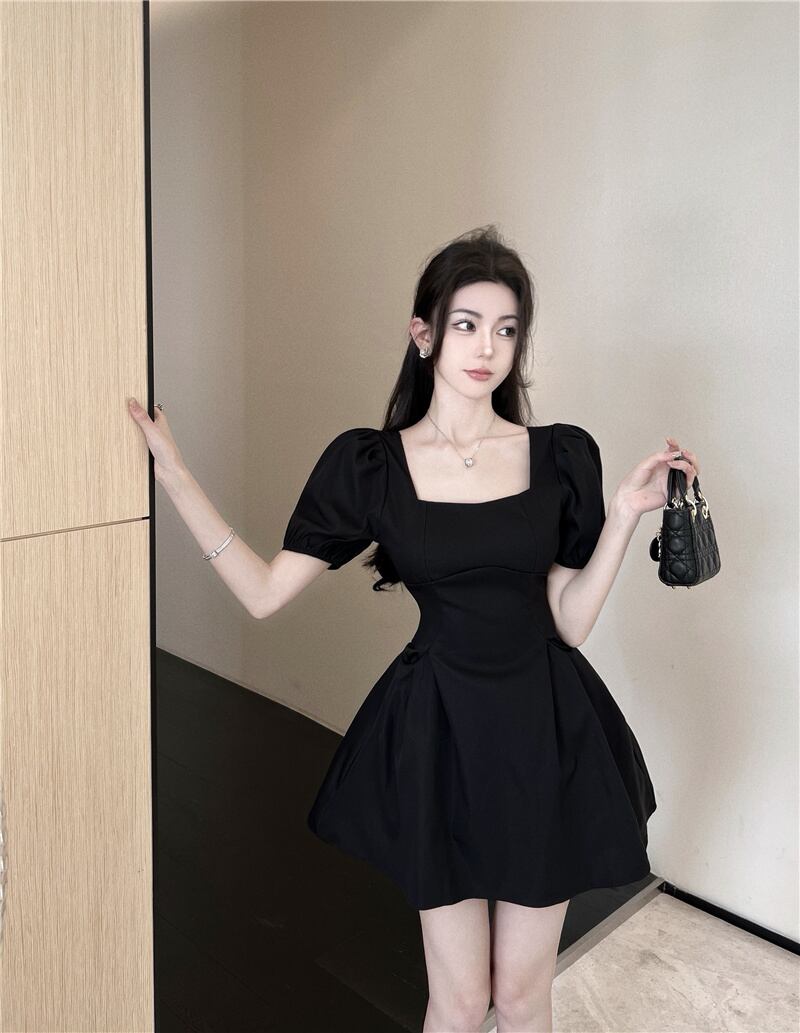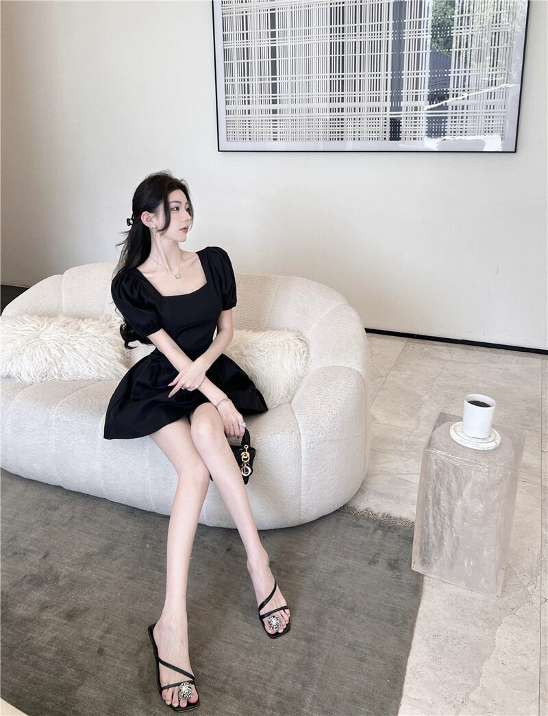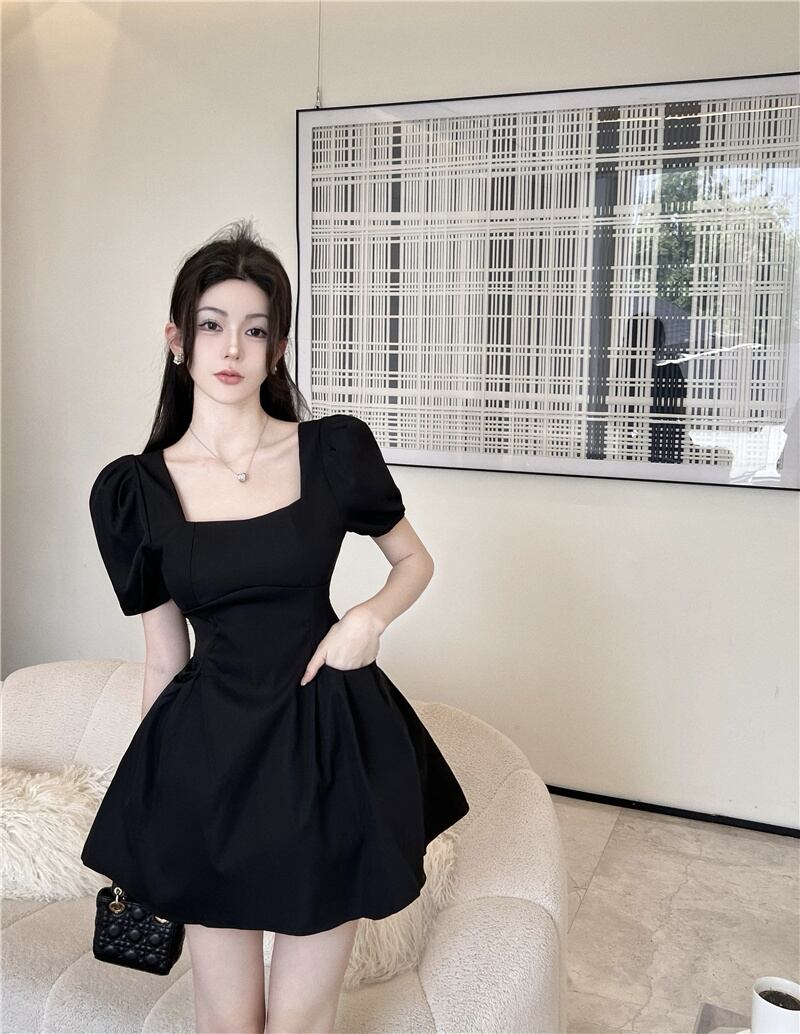 Black puff sleeves waist slim puffy skirt 2022 summer new French square neck sexy dress women's ブラック サマー 夏物 スカート スリム スクウェア nana45440544489 | modepoisson
