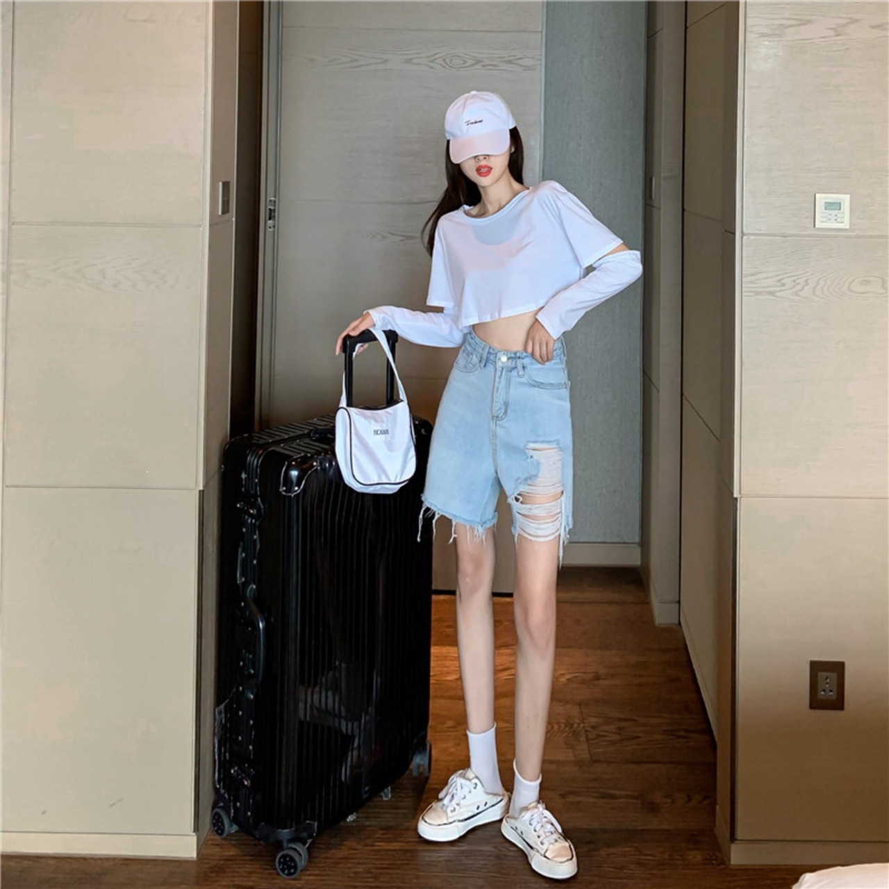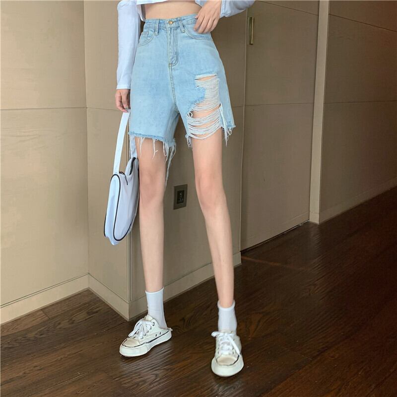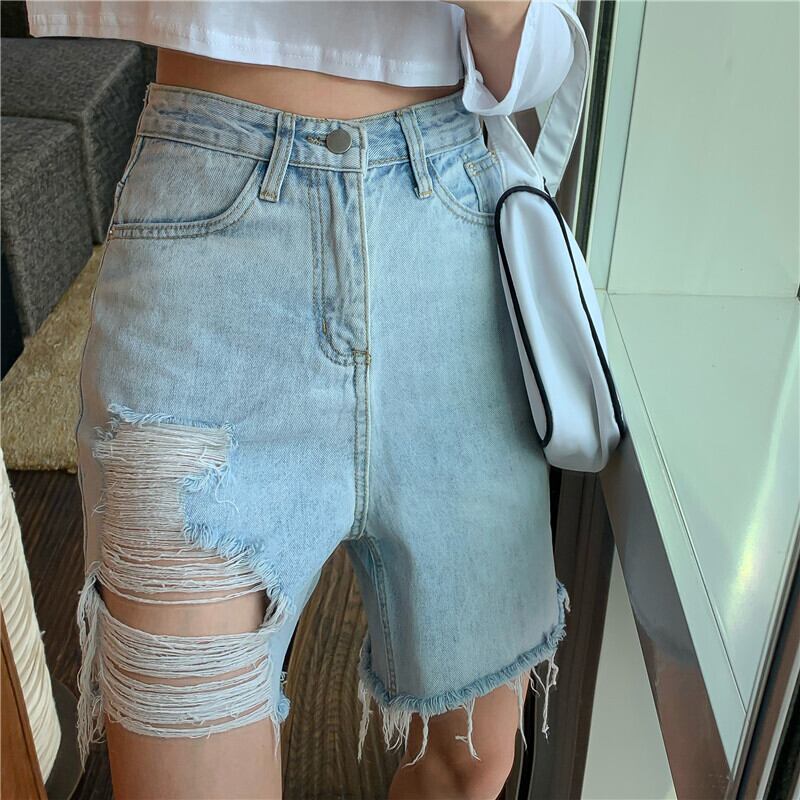 Thin ripped denim shorts 2022 summer new high-waisted thin women's straight-leg loose wide-leg pants five-point pants サマー 夏物 ショーツ ブルマー nana54448933985 | modepoisson