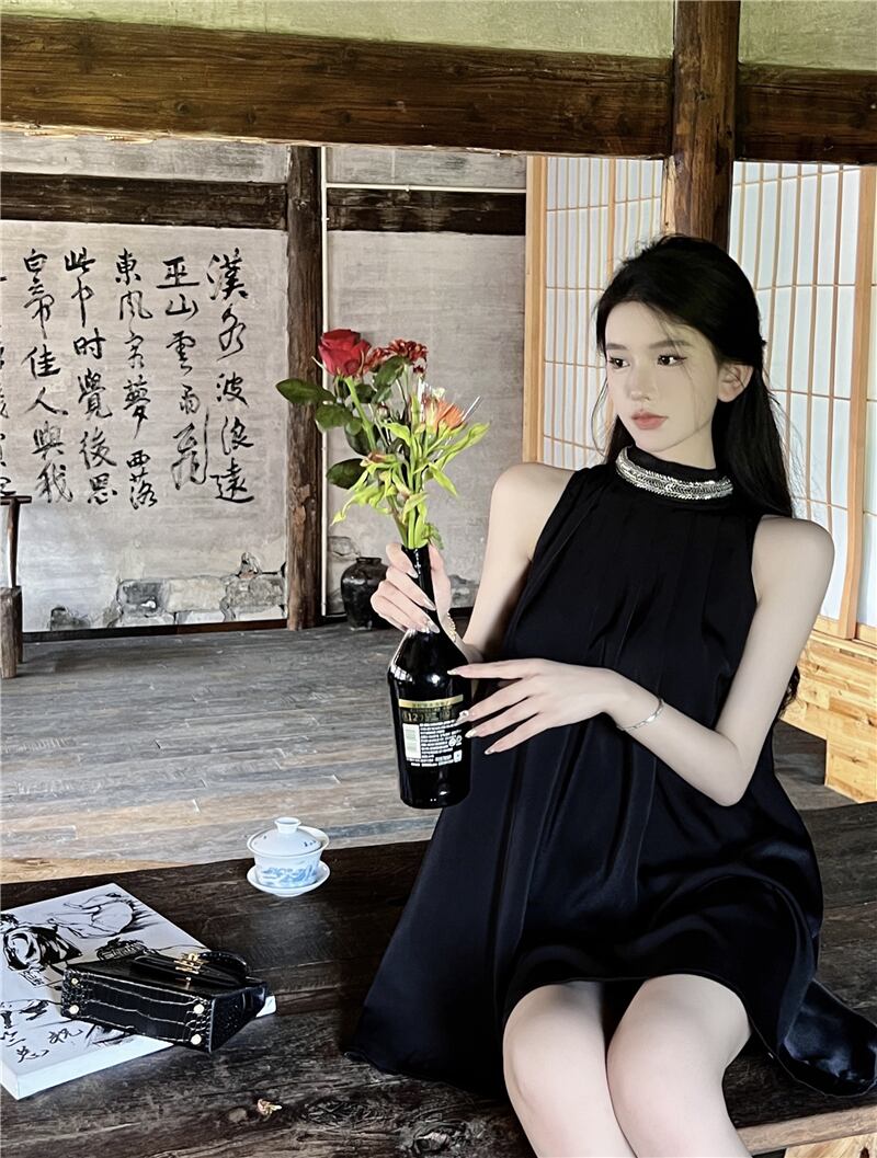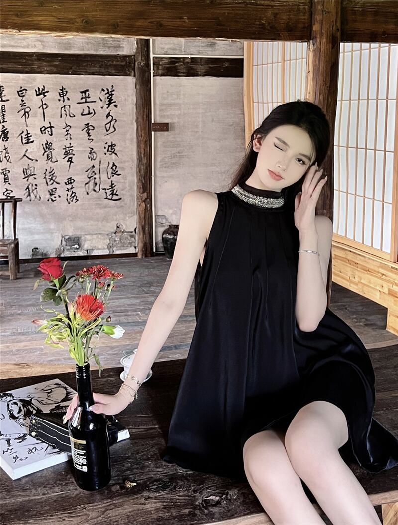 Black off-the-shoulder skirt 2022 summer new slim temperament a-line heavy industry sleeveless halter dress women's ブラック サマー 夏物 ノースリーブ スカート Aライン スリム nana20210426221 | modepoisson