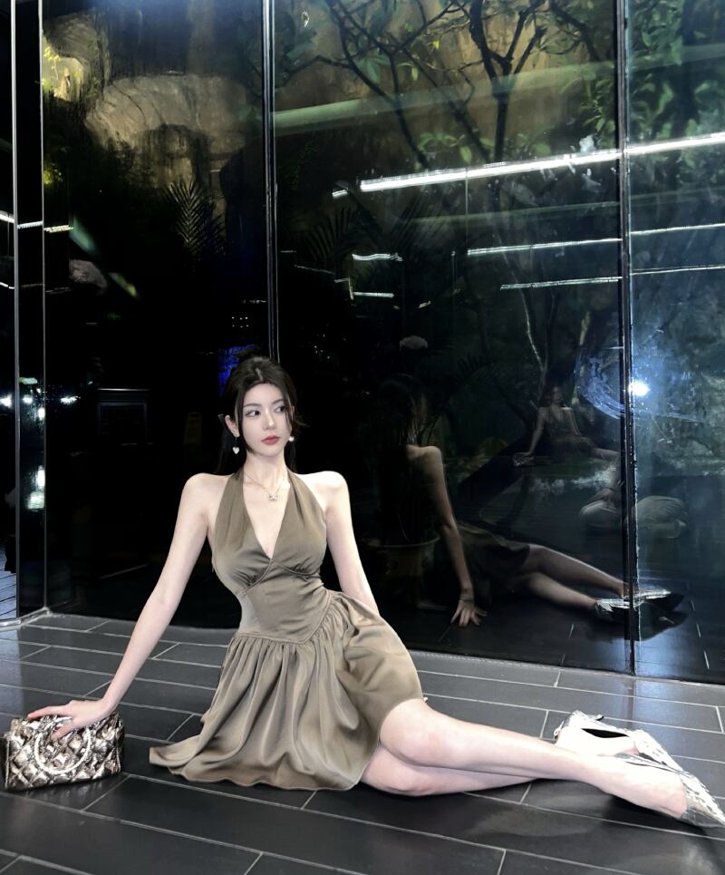 Satin halterneck suspender dress women's summer 2022 new sexy pure desire v-neck short skirt trendy ショート サマー 夏物 スカート Vネック サテン ピュア nana7459548717 | modepoisson