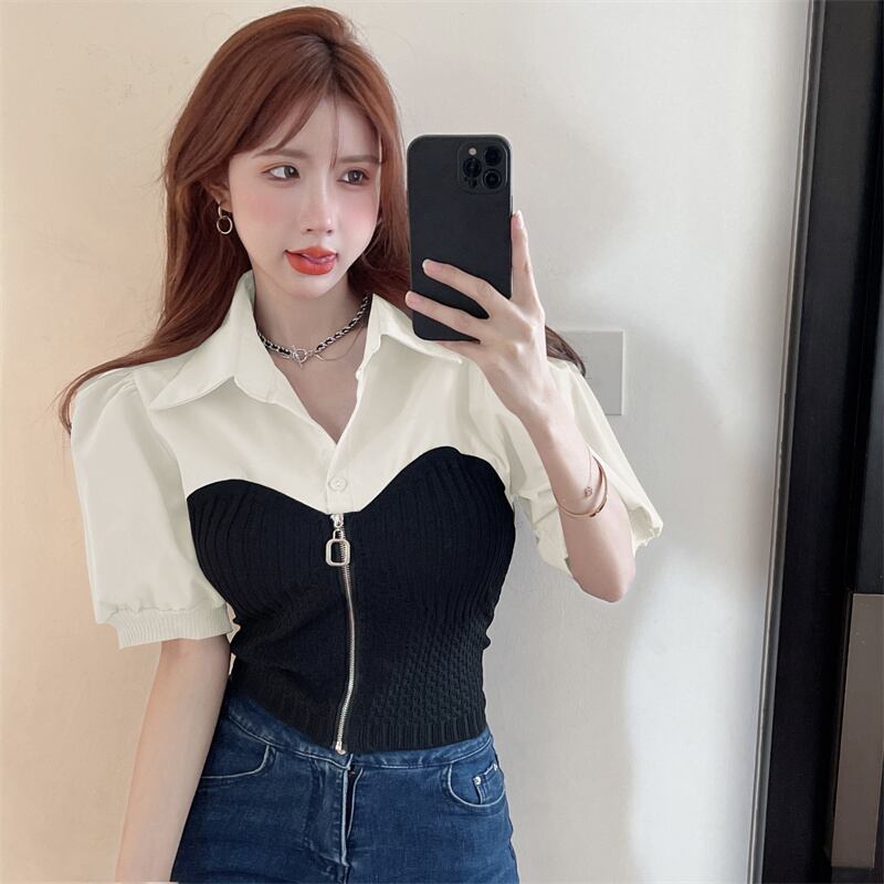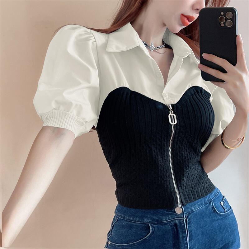 2022 summer new design niche fake two-piece short-sleeved shirt slim fit and slim puff sleeve top women's clothing サマー 夏物 スリム nana35504210924 | modepoisson