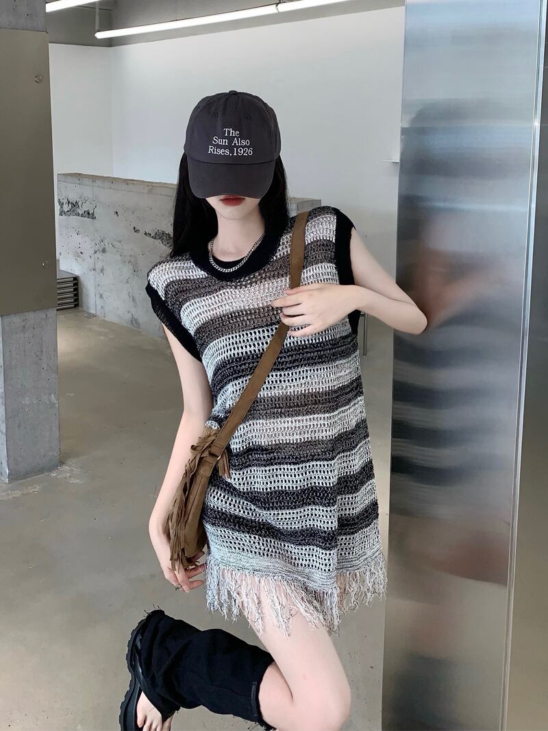Age-reducing Western-style striped sweater vest women's 2022 summer new round neck sleeveless loose vest tel top サマー 夏物 ノースリーブ Oネック ストライプ nana93518172575 | modepoisson